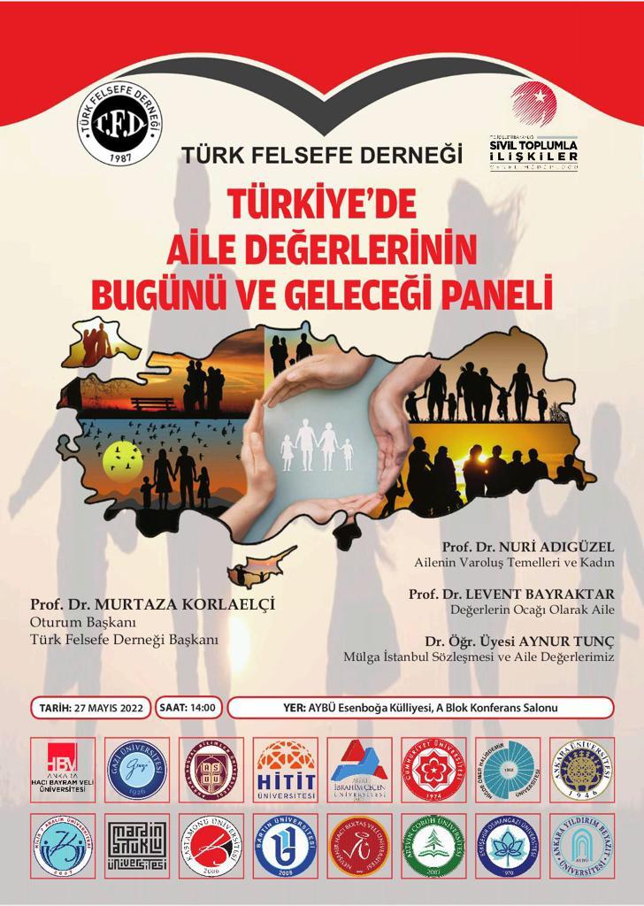 Her defasında farklı Üniversitelerin ev sahipliği yaptığı ve Türk Felsefe Derneği tarafından gerçekleştirilen panellerin 16. Oturumu olan “Türkiye’de Aile Değerlerinin Bu Günü ve Geleceği Paneli” 27 Mayıs 2022 Cuma günü saat 14.00'te Fakültemiz A Blok Konferans Salonunda icra edilecektir.