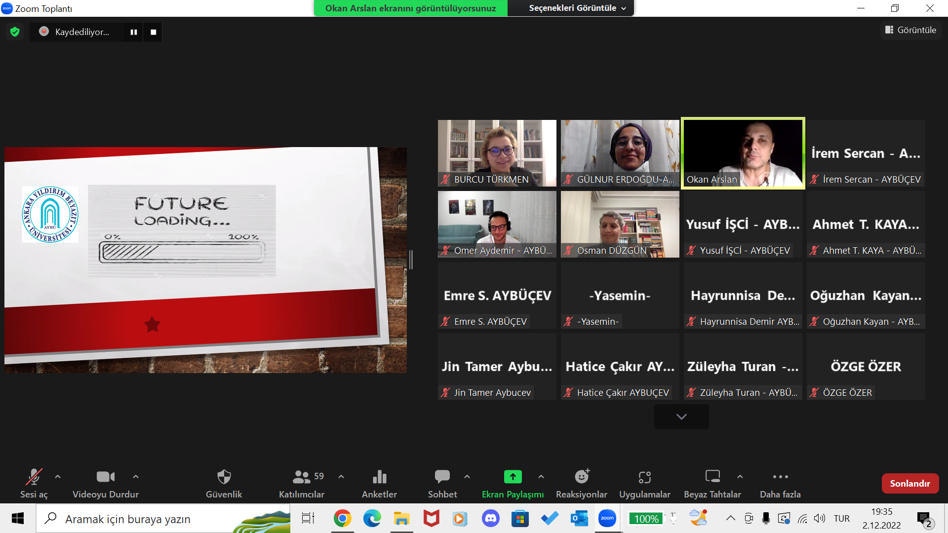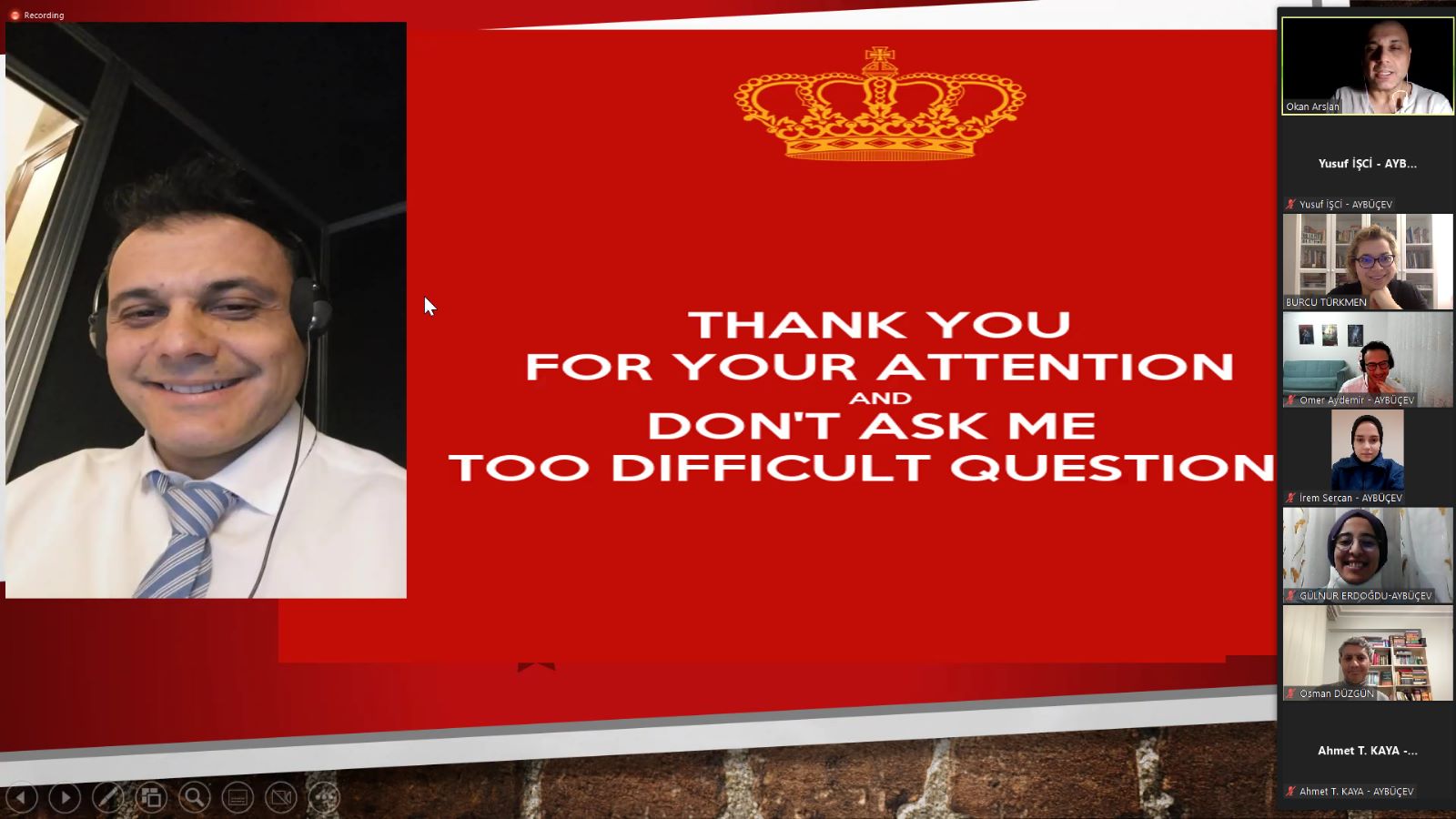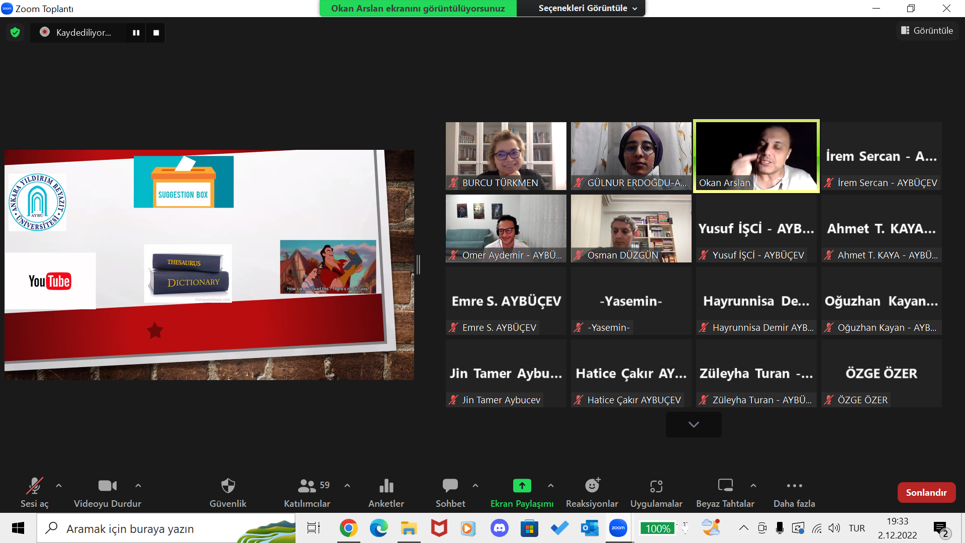 AYBÜ Çeviri Topluluğu tarafından düzenlenen 2022-2023 Güz Dönemi Söyleşileri kapsamında, 02.12.2022 tarihinde moderatörlüğünü İngilizce Mütercim Tercümanlık Bölümümüzden Dr. Öğr. Üyesi Burcu Türkmen'in yaptığı,  ABD Büyükelçiliği Çevirmeni Sn. Okan ARSLAN ile "Sözlü Kurum Çevirmenliği - Karşılaşılan Güçlükler, Avantajlar" başlıklı çevrimiçi bir söyleşi gerçekleştirilmiştir.