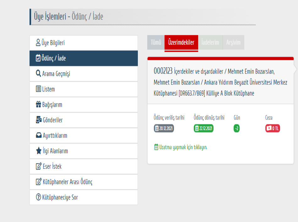 2. Ödünç/İade sekmesinden, iade tarihine son 3 gün kala "uzatma yapmak için tıklayın'dan" ilgili kitap 15 gün süre ile otomatik olarak bir defaya mahsus uzatılabilir.