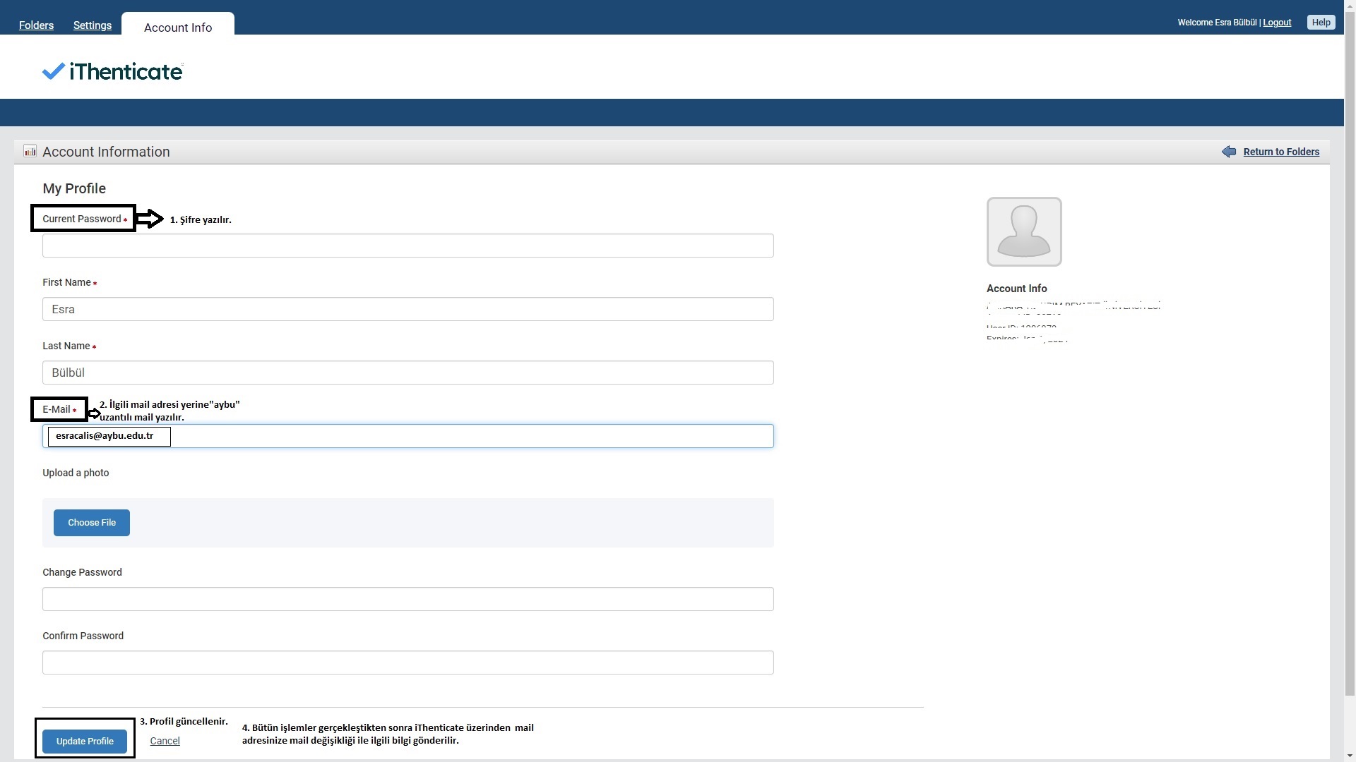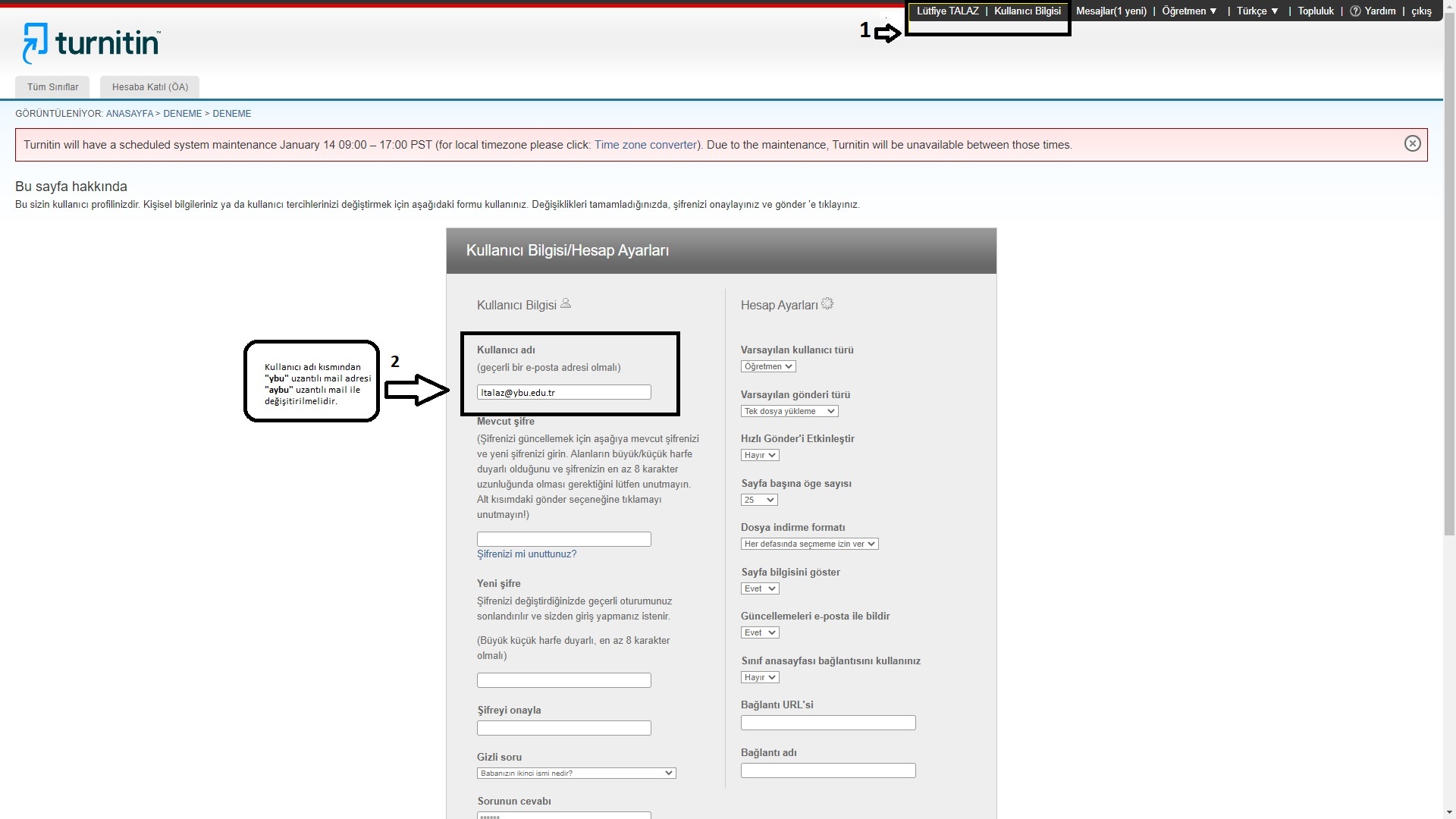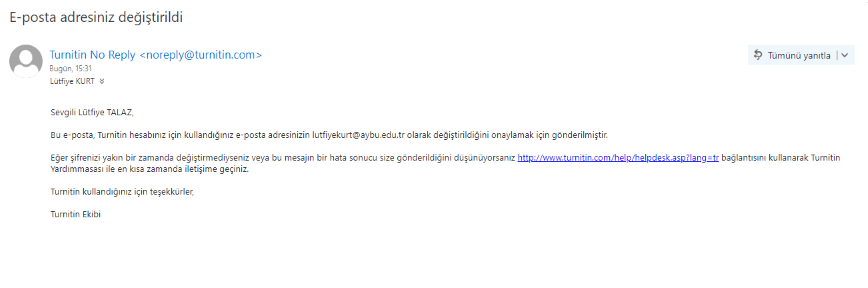 Üniversitemizin kurumsal mail uzantısı ...@ybu.edu.tr'den ...@aybu.edu.tr'ye geçmektedir. Bu sebeple Turnitin ve iThenticate hesaplarınızın aktif kullanılabilmesi için kullanıcı hesabınızın "aybu" uzantılı mail adresi ile değiştirilmesi gerekmektedir.  Maili değişikliği ile ilgili bilgiler görsel olarak yer almaktadır.