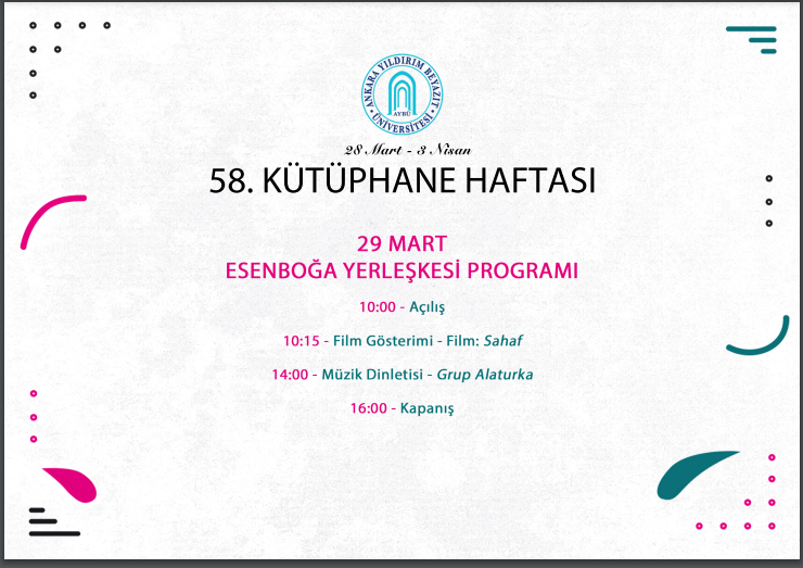 58. Kütüphane Haftası adı altında gerçekleştirilecek konser ve film etkinliği Esenboğa Merkez Külliyesi A Blok Konferans Salonunda saat 10:00'da başlayacaktır. Konser ve film etkinliği 15 Temmuz Şehitleri Yerleşkesinde de A Blok Konferans Salonunda gerçekleşecektir.