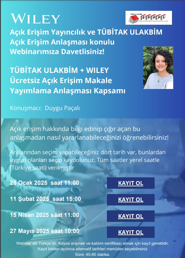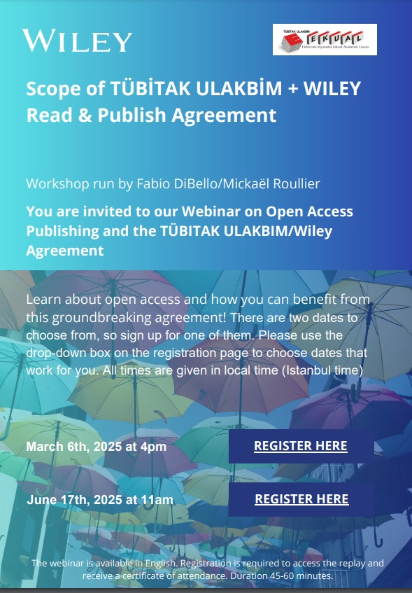 TÜBİTAK ULAKBİM ile Wiley arasında yapılan ücretsiz açık erişim makale yayımlama anlaşması hakkında araştırmacılara yönelik webinar düzenlenecektir.