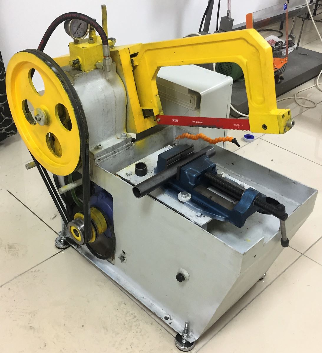 Yine Prof. Dr. Adem ÇİÇEK hocamızın öğrencileri tarafından çift devirde çalıştırılabilen, hidrolik kol ile otomatik kesme gerçekleştirebilen bir hidrolik kollu testere imalatı yapılmıştır.