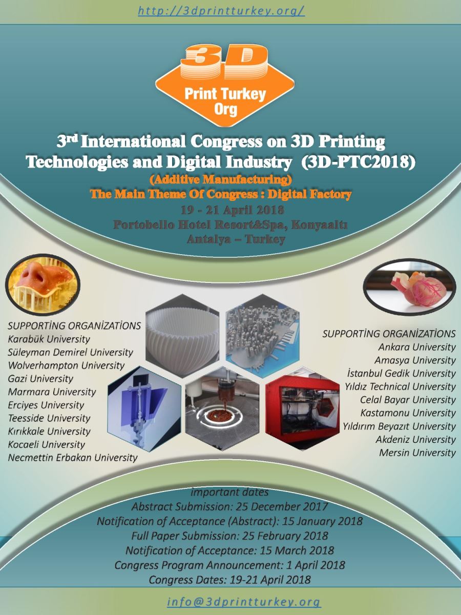 Bölümümüz hocalarından Sayın Yard. Doç. Dr. İhsan Toktaş'ın da Düzenleme Kurulu'nde bulunduğu 3 Boyutlu Baskı Teknolojileri ve Dijital Endüstri Sempozyumu (3D-PTC2018) sayfasına aşağıdaki linkten ulaşabilirsiniz.
