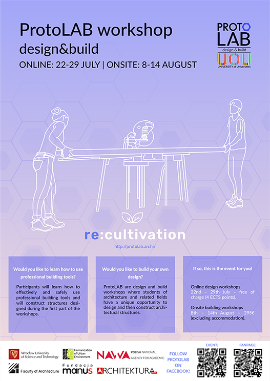 ProtoLAB are design and build workshops where students of architecture and related fields have a unique opportunity to design and then construct architectural structures. The workshops are divided into online design part and on site production process, which will take place in the beautiful city of Wrocław, in Poland.