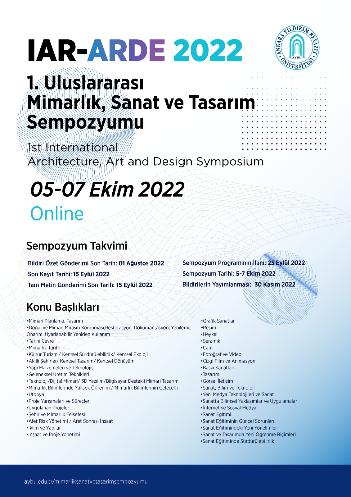 Sizleri Ankara Yıldırım Beyazıt Üniversitesi Mimarlık ve Güzel Sanatlar Fakültesi tarafından düzenlenen 1. Uluslararası Mimarlık, Sanat ve Tasarım Sempozyumu'na (IAR-ARDE 2022) davet ediyoruz. Sempozyum 5-7 Ekim 2022 tarihlerinde online olarak gerçekleştirilecektir.