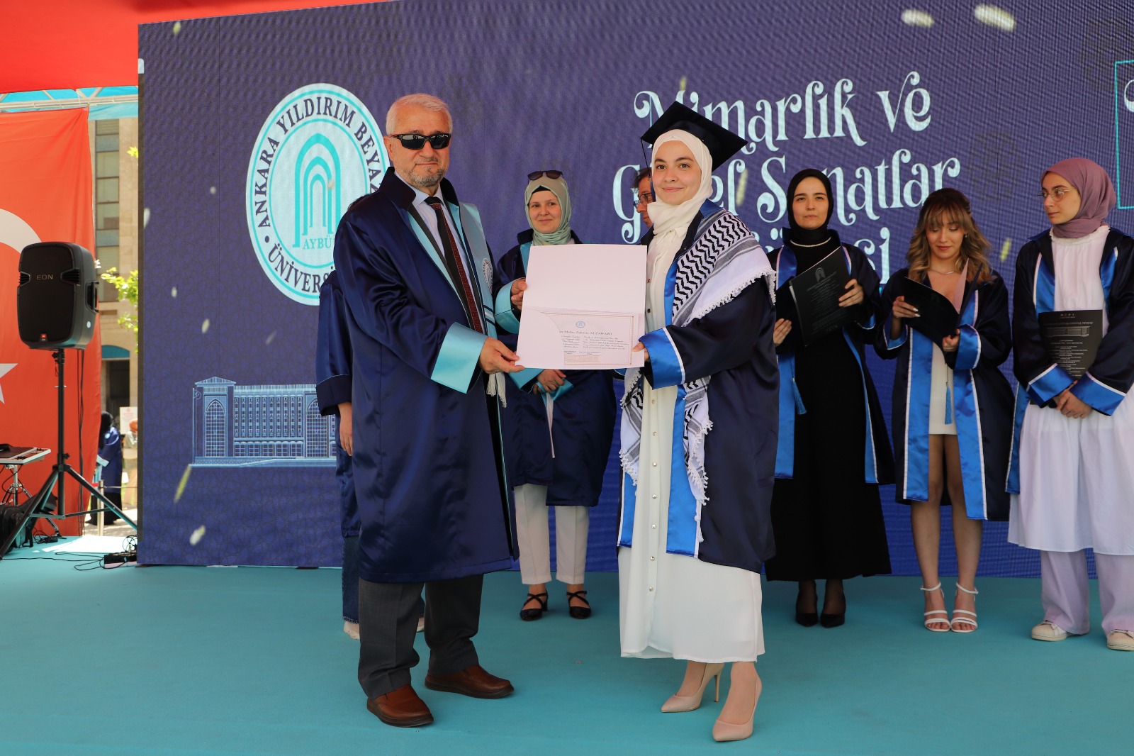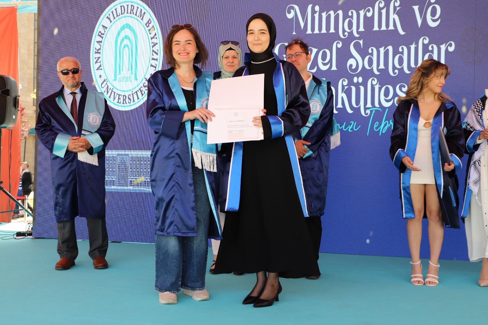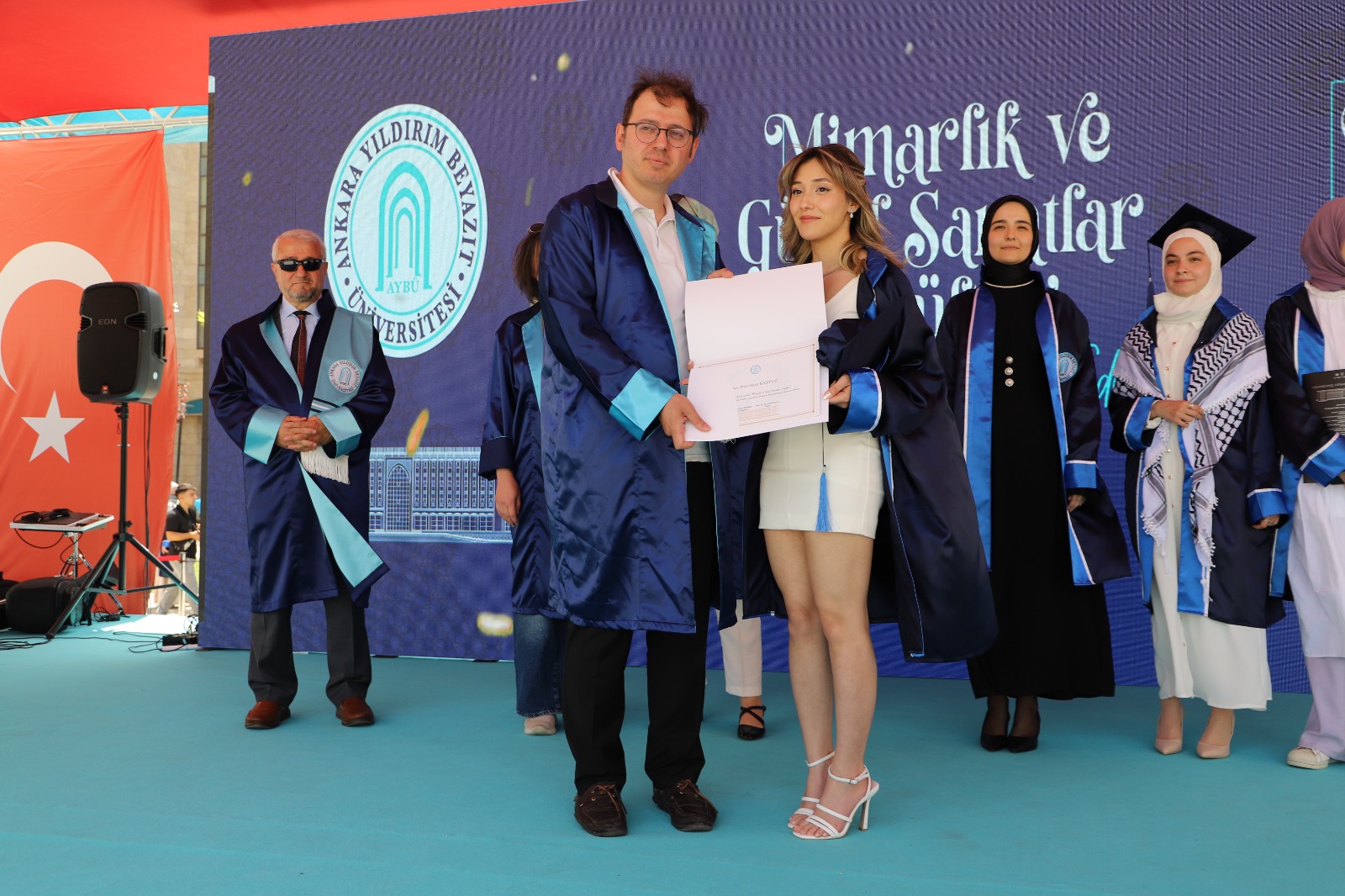 Mimarlık ve Güzel Sanatlar Fakültesi mezuniyet töreni 12 Haziran 2024 Çarşamba günü Esenboğa Yerleşkesinde gerçekleşti. Sayın dekanımız Prof.Dr.Arif Ankaralı’nın konuşması ile başlayan tören, Sayın Rektörümüz Prof. Dr. Ali Cengiz Köseoğlu’nun açılış ve selamlama konuşması ile devam etti. Program Mimarlık Bölümü öğretim elemanları ve 51 mezun öğrencimiz ve ailelerinin katılımıyla gerçekleştirildi. Programda öncelikle bölüm birincisi, ikincisi, üçüncüsü ve onur öğrencisine belge takdimi yapıldı. Mimarlık Bölüm birincisi Rukiye Aydoğdu’ya belgesini Mimarlık Bölüm Başkanımız Doç. Dr. Şeyda Emekci, bölüm ikincisi Nisa Ilgın Baştuğ’a belgesini Dekan Yardımcımız Doç. Dr. Ahmet Emre Dinçer, bölüm üçüncüsü Mehlika İrem Demirel’e belgesini Mimarlık Bölüm Başkan Yardımcımız Dr. Öğretim Üyesi Cemile Feyzan Şimşek, bölüm yüksek onur öğrencisi Noor Alzawawi’ye belgesini Sayın Dekanımız Prof. Dr. Arif Ankaralı takdim etti. Belge takdimi sonrası bütün öğrencilerin ve öğretim elemanlarının katılımıyla hatıra fotoğrafı çektirildi. Mezun öğrencilerimize mesleki hayatlarında başarılar dileriz.
