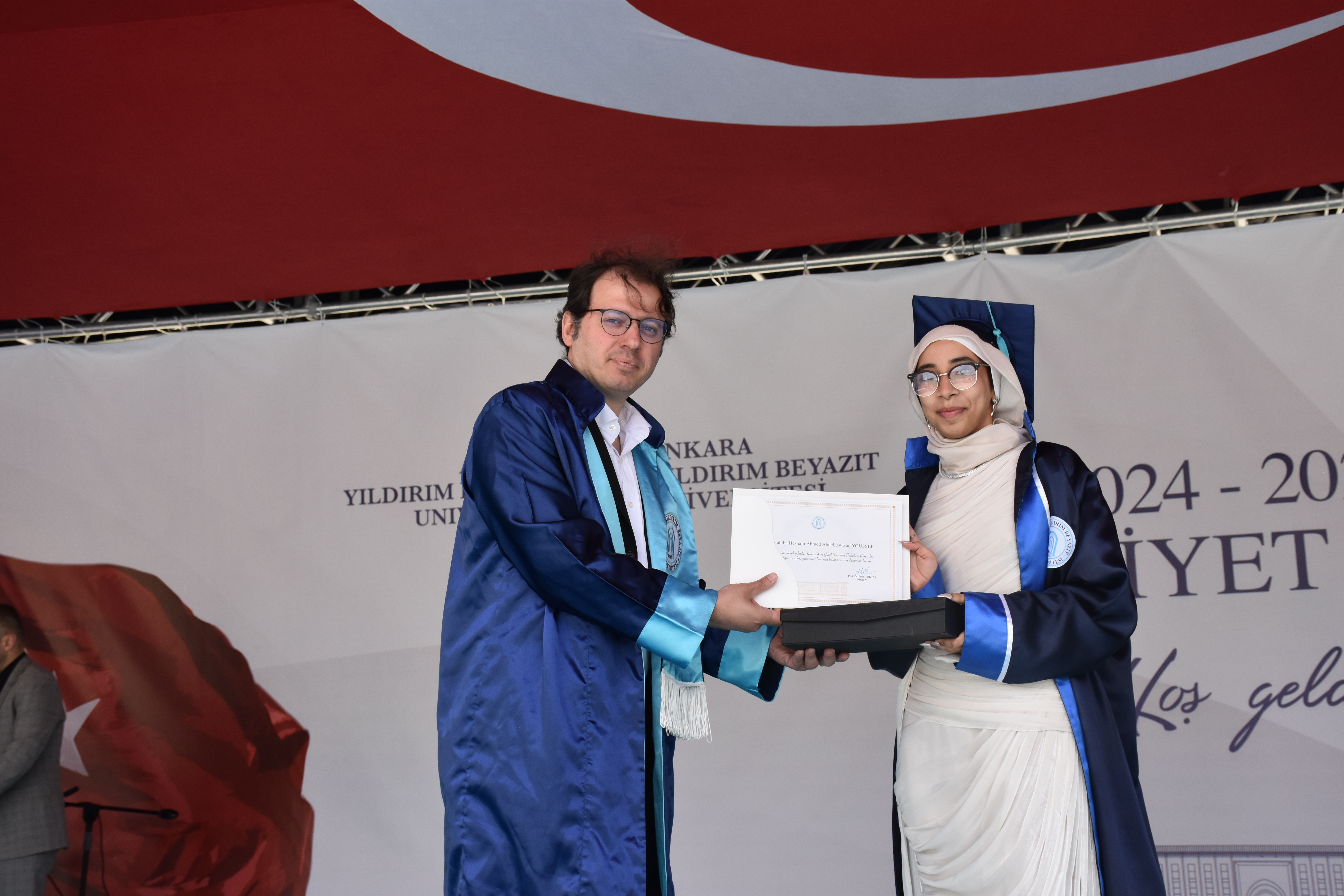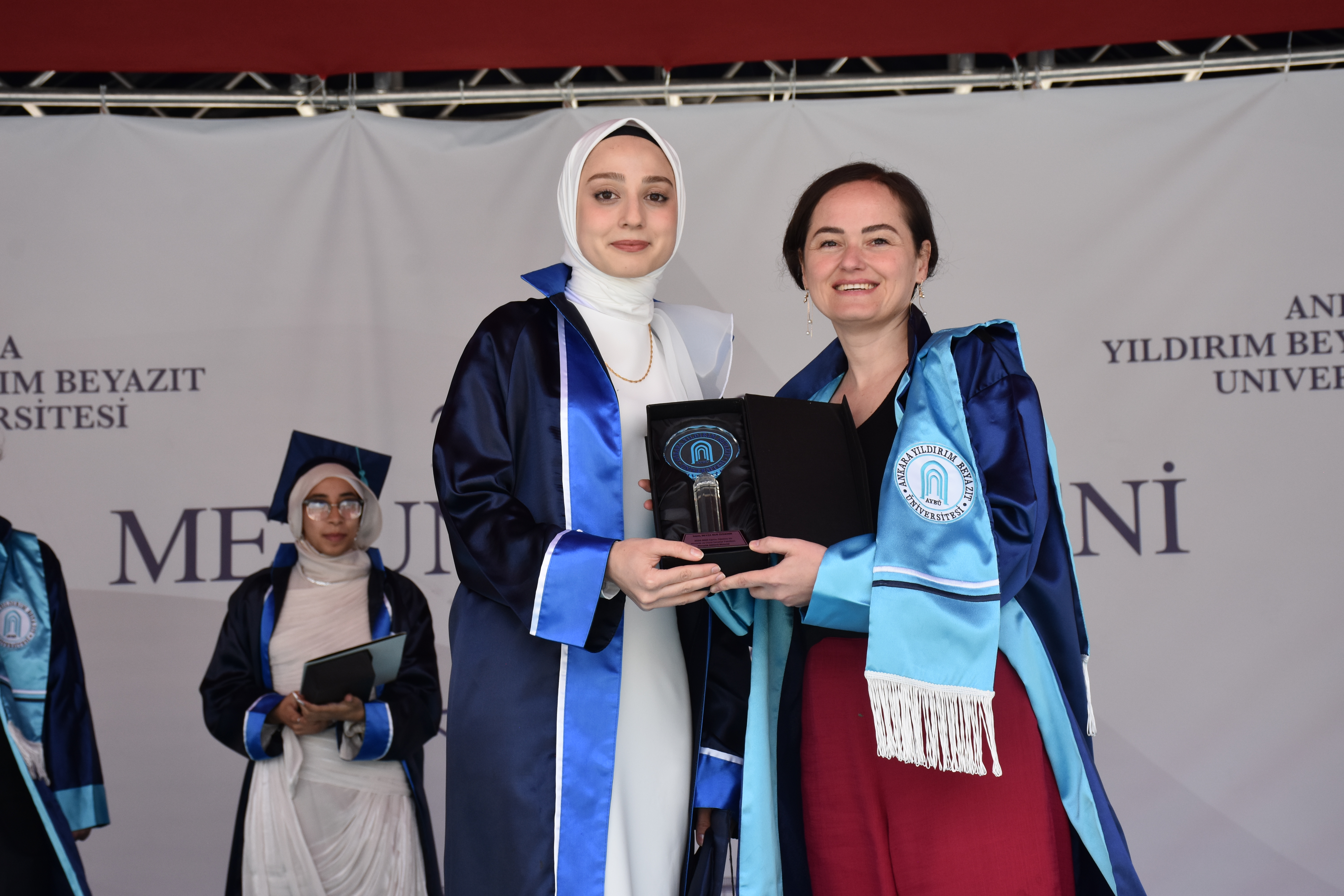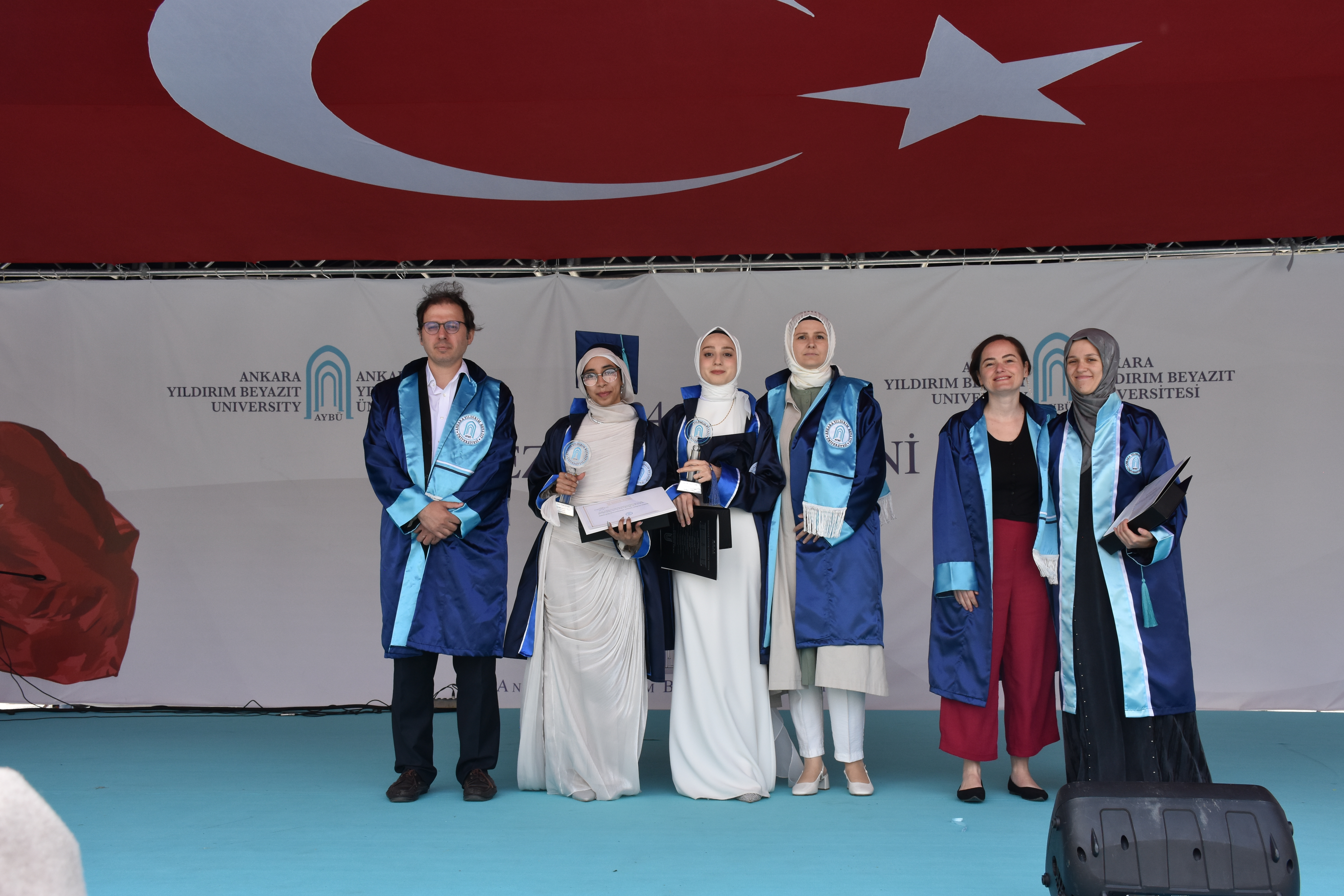 Mimarlık ve Güzel Sanatlar Fakültesi mezuniyet töreni 27 Mayıs 2025 Salı günü Esenboğa Yerleşkesinde gerçekleşti. Sayın dekanımız Prof.Dr. İhsan Toktaş'ın konuşması ile başlayan tören, Sayın Rektörümüz Prof. Dr. Ali Cengiz Köseoğlu’nun açılış ve selamlama konuşması ile devam etti. Program Mimarlık Bölümü öğretim elemanları, mezun öğrencimiz ve ailelerinin katılımıyla gerçekleştirildi. Programda öncelikle bölüm birincisi, ikincisi, ve üçüncüsüne belge takdimi yapıldı. Mimarlık Bölüm birincisi Beyza Nur Özdemir'e belgesini Mimarlık Bölüm Başkanımız Doç. Dr. Şeyda Emekci, bölüm ikincisi Habiba Hesham Ahmed Abdelgawwad Youssef’e belgesini Dekan Yardımcımız Doç. Dr. Ahmet Emre Dinçer, bölüm üçüncüsü Ayşenur Demir’e belgesini Mimarlık Bölüm Başkan Yardımcımız Dr. Öğretim Üyesi Cemile Feyzan Şimşek takdim etti. Belge takdimi sonrası bütün öğrencilerin ve öğretim elemanlarının katılımıyla hatıra fotoğrafı çektirildi. Mezun öğrencilerimize mesleki hayatlarında başarılar dileriz.
