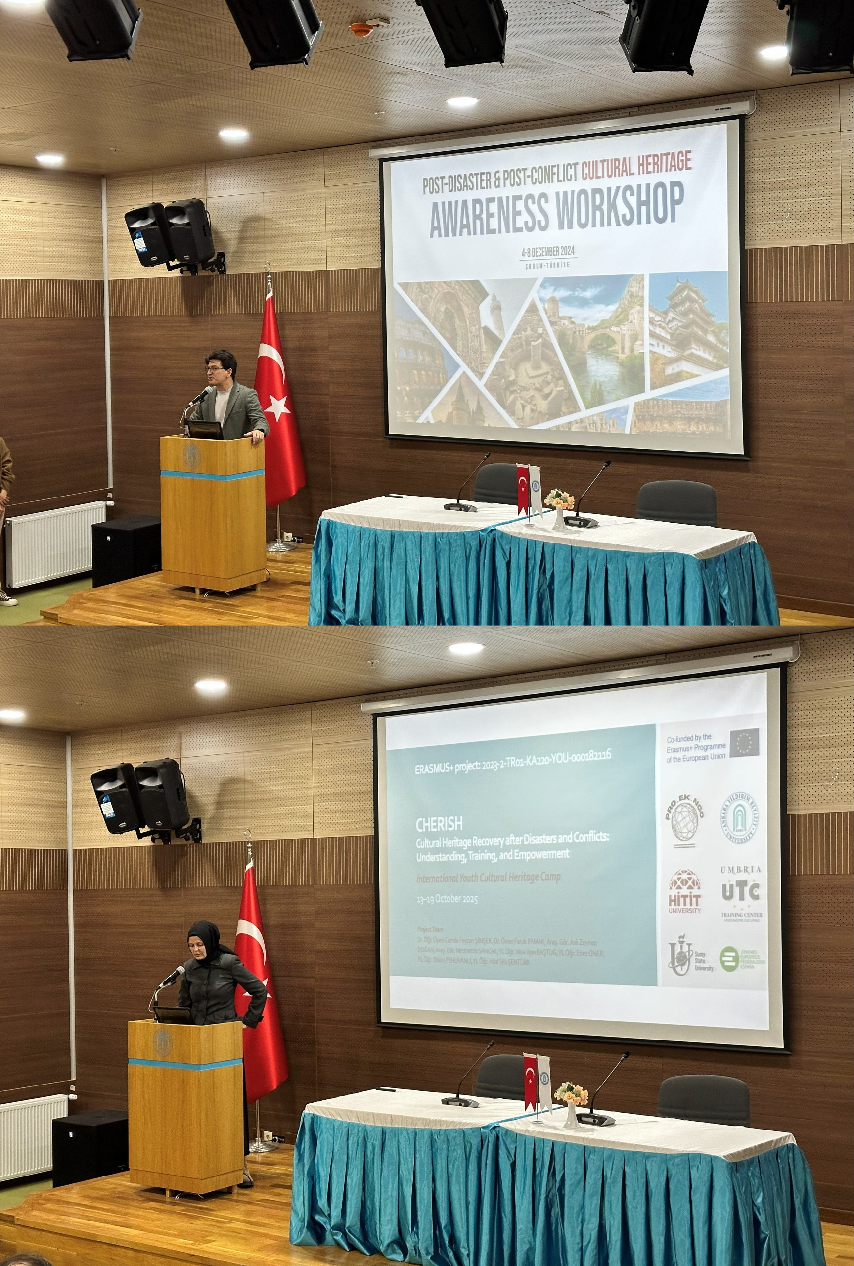 The session began with Assoc. Prof. Recep Yorulmaz, who introduced the Erasmus+ program, its opportunities, and the objectives of the CHERISH project. Following this, Asst. Prof. Dr. Cemile Feyzan Şimşek, the team leader, presented the first day’s activities, including the introductory sessions, ice-breaking exercises, and a cultural tour of Spoleto.