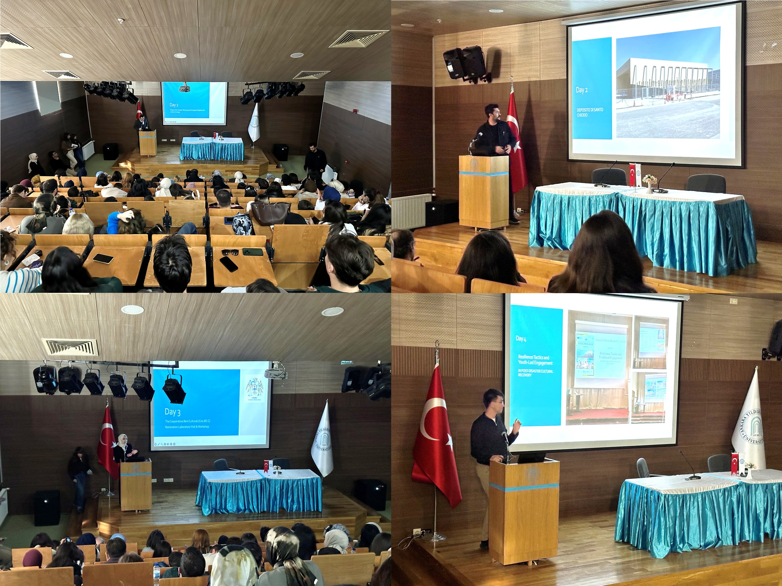 The third day, presented by Res. Asst. Aslı Zeynep Doğan and MSc. Student Dilara Pehlivanlı, focused on the Coo.Be.C. Restoration Laboratory and the workshop “From Emergency to Restoration.” This hands-on session on ceramic and canvas restoration aimed to raise awareness about cultural heritage protection and allowed participants to experience real conservation practices under expert supervision.