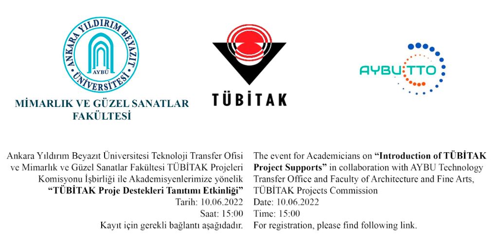 An online event for Academicians on “Introduction of TÜBİTAK Project Supports” is going to be organized on 10.06.2022 at 15:00 in collaboration with AYBU Technology Transfer Office and Faculty of Architecture and Fine Arts, TÜBİTAK Projects Commission. For registration with your name, surname and e-mail, please use following link.