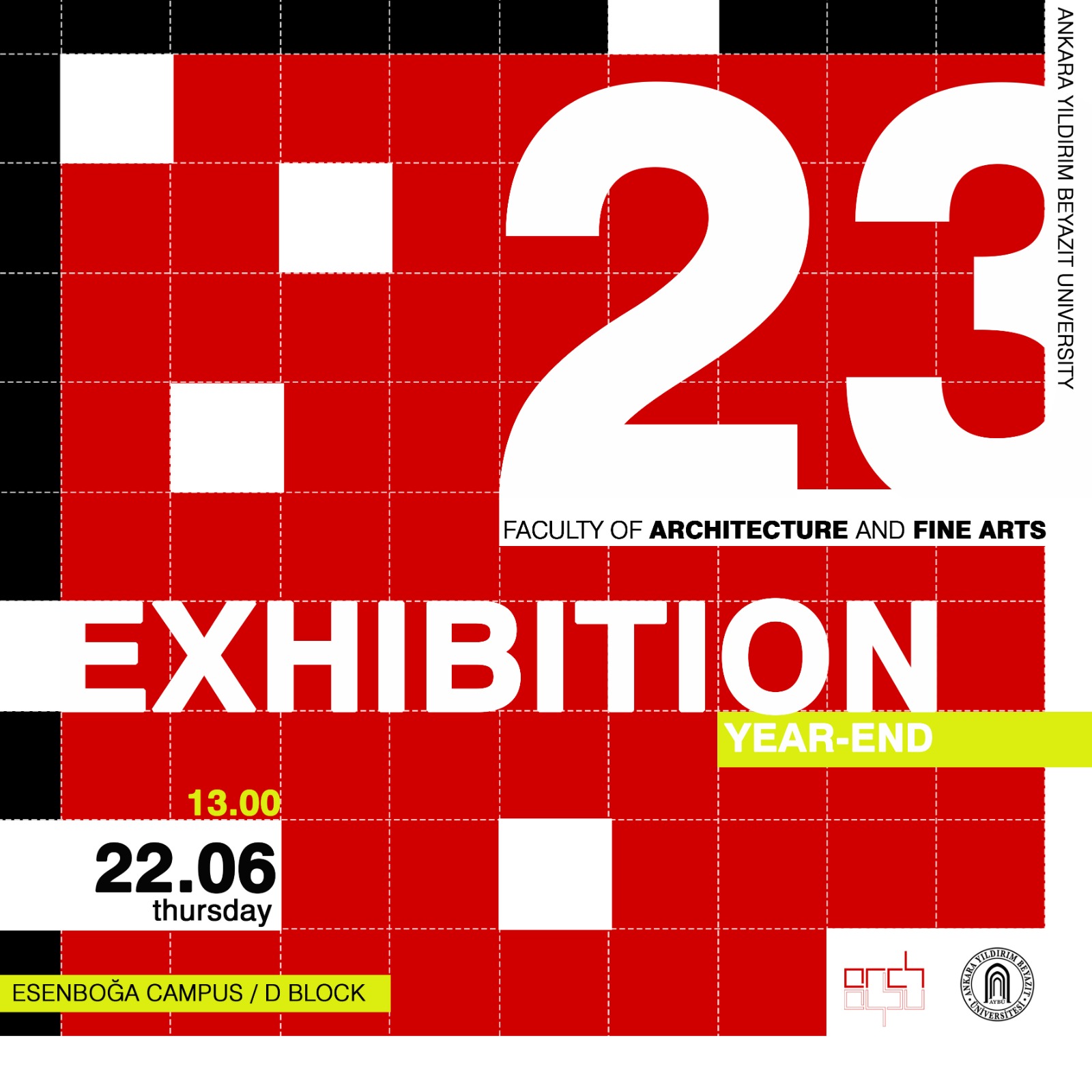 Ankara Yıldırım Beyazıt Üniversitesi Mimarlık ve Güzel Sanatlar Fakültesi tarafından düzenlenen 2022-2023 yıl sonu sergisine davetlisiniz! Etkinliğimiz 22 Haziran Perşembe günü yapılacak olan mezuniyet programını takiben Esenboğa Kampüsü D Blok giriş katta gerçekleşecektir. Program, açılış konuşması, bölüm birinci, ikinci ve üçüncüsü olan öğrencilere sertifikalarının takdimi ve sergi açılışı ile devam edecektir. Tüm öğrencilerimizi ve ailelerini aramızda görmekten mutluluk duyarız!