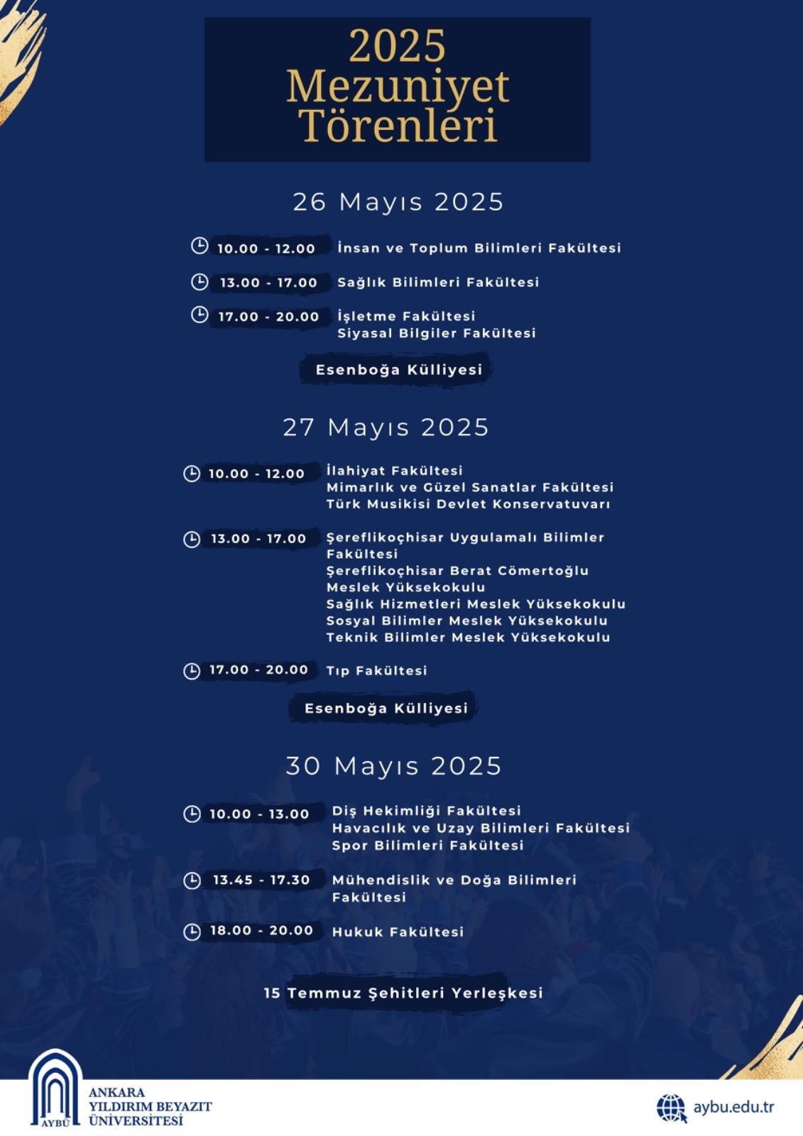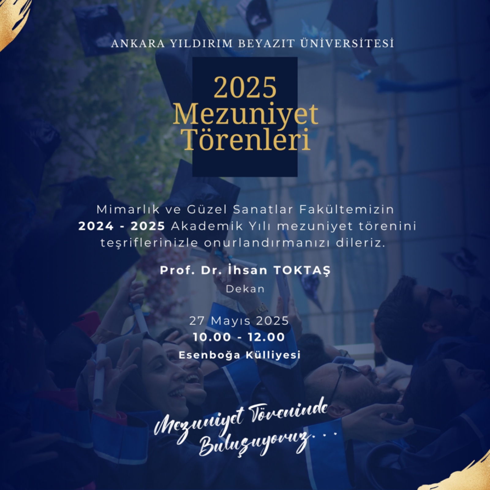 Mimarlık ve Güzel Sanatlar Fakültesi 2024-2025 Akademik Yılı mezuniyet töreni, 27 Mayıs 2025 Salı günü saat 10.00 - 12.00 arasında Esenboğa Külliyesi'nde gerçekleştirilecektir.
