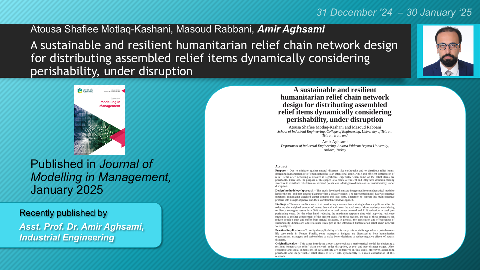 arXiv preprint arXiv:2501.12251 A sustainable and resilient humanitarian relief chain network design for distributing assembled relief items dynamically considering perishability, under disruption Atousa Shafiee Motlaq-Kashani and Masoud Rabbani and Amir Aghsami