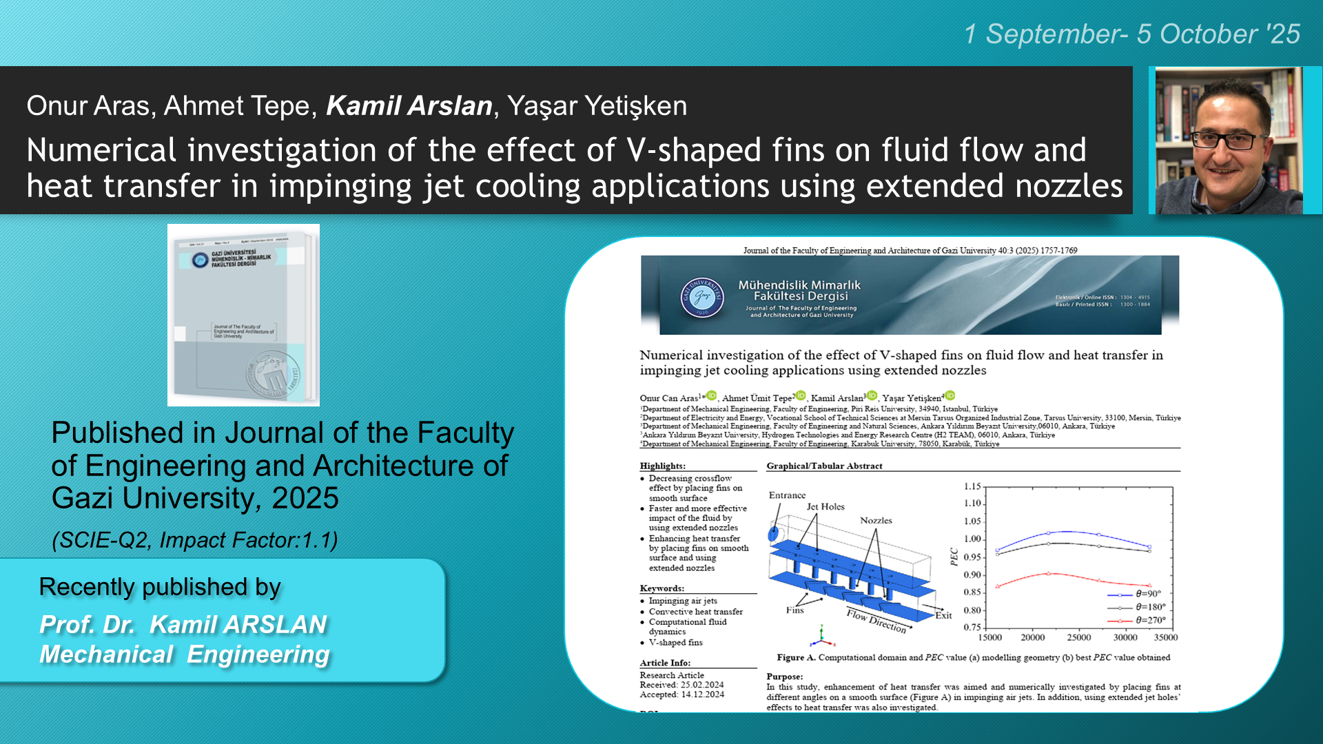 Journal of Cleaner Production, Cilt 262, Sayfalar 121424 A comprehensive review on wireless capacitive power transfer technology: Fundamentals and applications Mehmet Zahid Erel and Kamil Cagatay Bayindir and Mehmet Timur Aydemir and Sanjay K Chaudhary and Josep M Guerrero Experimental and numerical investigation of jet impingement cooling using extended jet holes Ahmet Ümit Tepe and Yaşar Yetişken and Ünal Uysal and Kamil Arslan