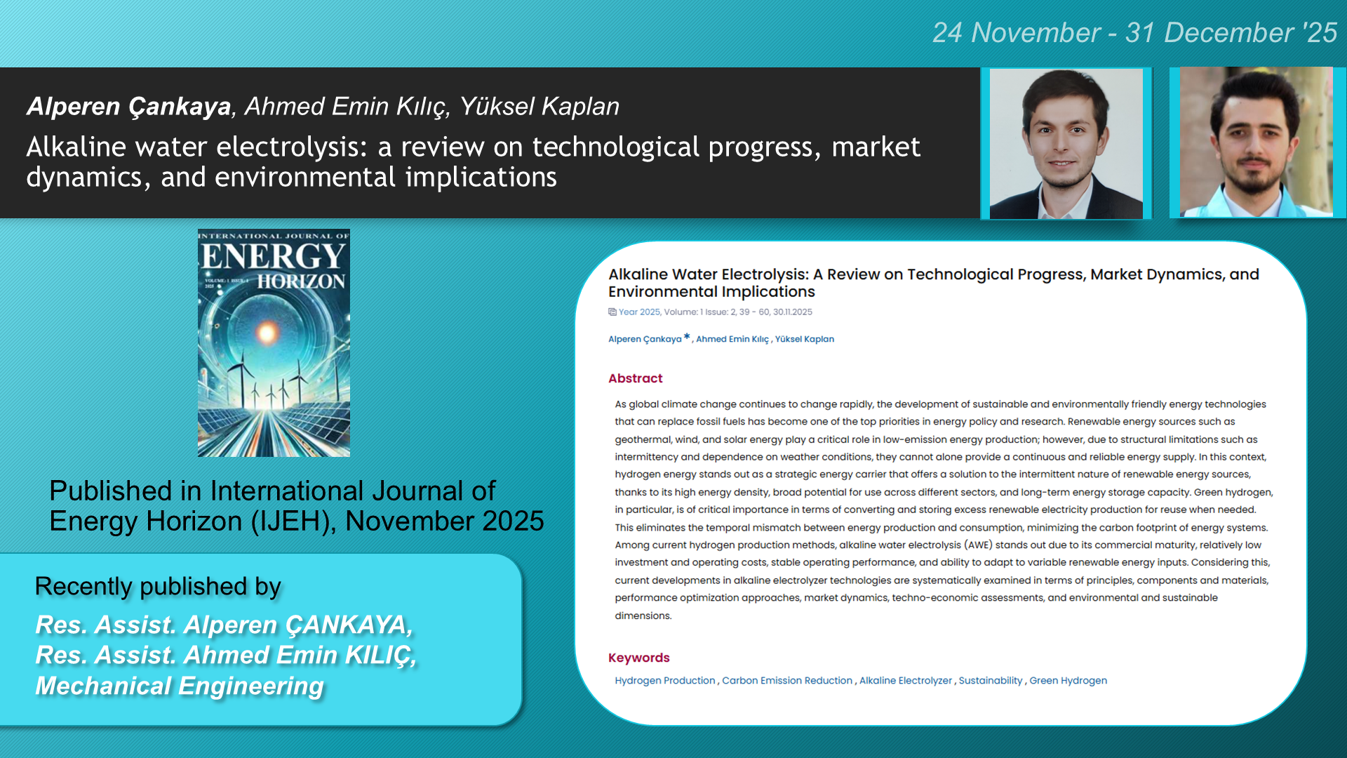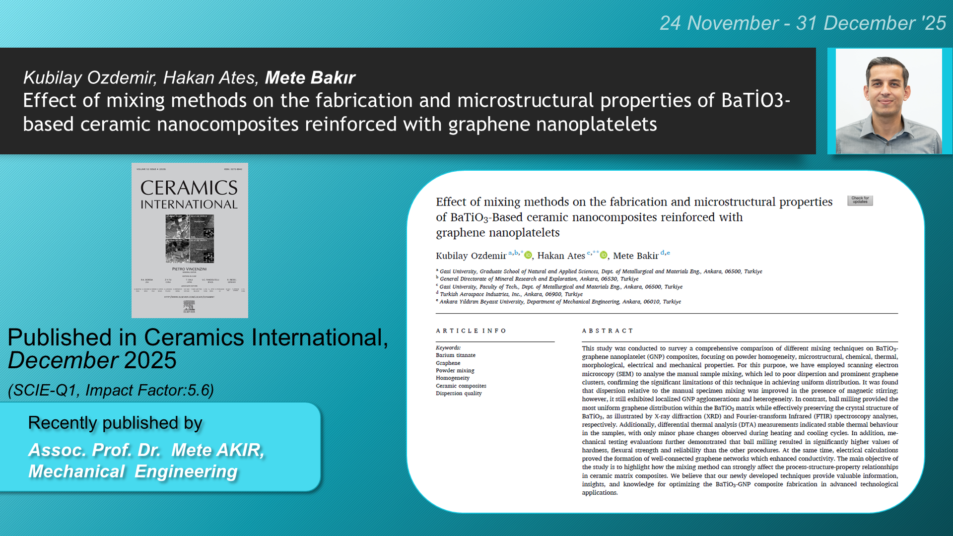 Additive Manufacturing Conference 2025, Sayfalar 100 Alkaline Water Electrolysis: A Review on Technological Progress, Market Dynamics, and Environmental Implications Alperen Çankaya and Ahmed Emin Kılıç and Yüksel Kaplan Effect of Mixing Methods on the Fabrication and Microstructural Properties of BaTiO3-Based Ceramic Nanocomposites Reinforced with Graphene Nanoplatelets Kubilay Ozdemir and Hakan Ates and Mete Bakir