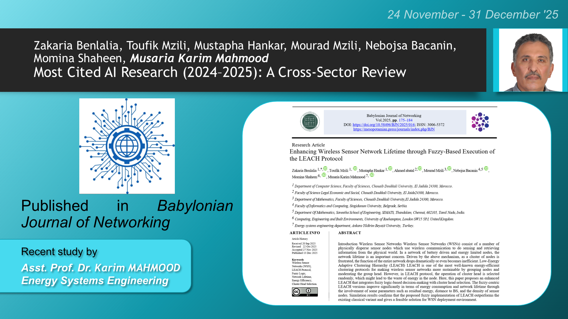 Engineering Science and Technology, an International Journal, Cilt 72, Sayfalar 102241 Enhancing Wireless Sensor Network Lifetime through Fuzzy-Based Execution of the LEACH Protocol Zakaria Benlalia and Toufik Mzili and Mustapha Hankar and Mourad Mzili and Nebojsa Bacanin and Momina Shaheen and Musaria Karim Mahmood