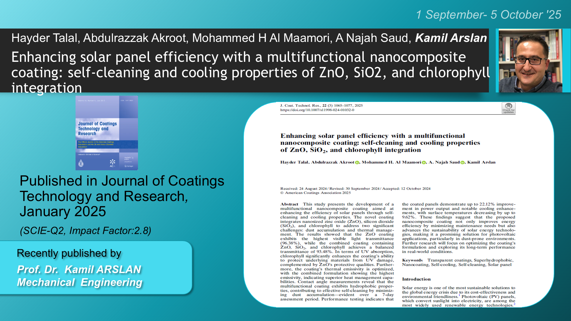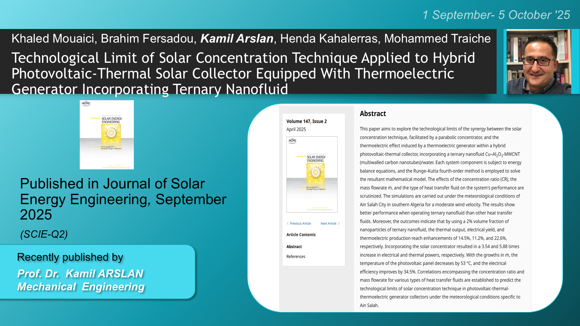Journal of Coatings Technology and Research, Cilt 22, Sayı 3, Sayfalar 1065-1077 Technological Limit of Solar Concentration Technique Applied to Hybrid Photovoltaic-Thermal Solar Collector Equipped With Thermoelectric Generator Incorporating Ternary Nanofluid Khaled Mouaici and Brahim Fersadou and Kamil Arslan and Henda Kahalerras and Mohammed Traiche