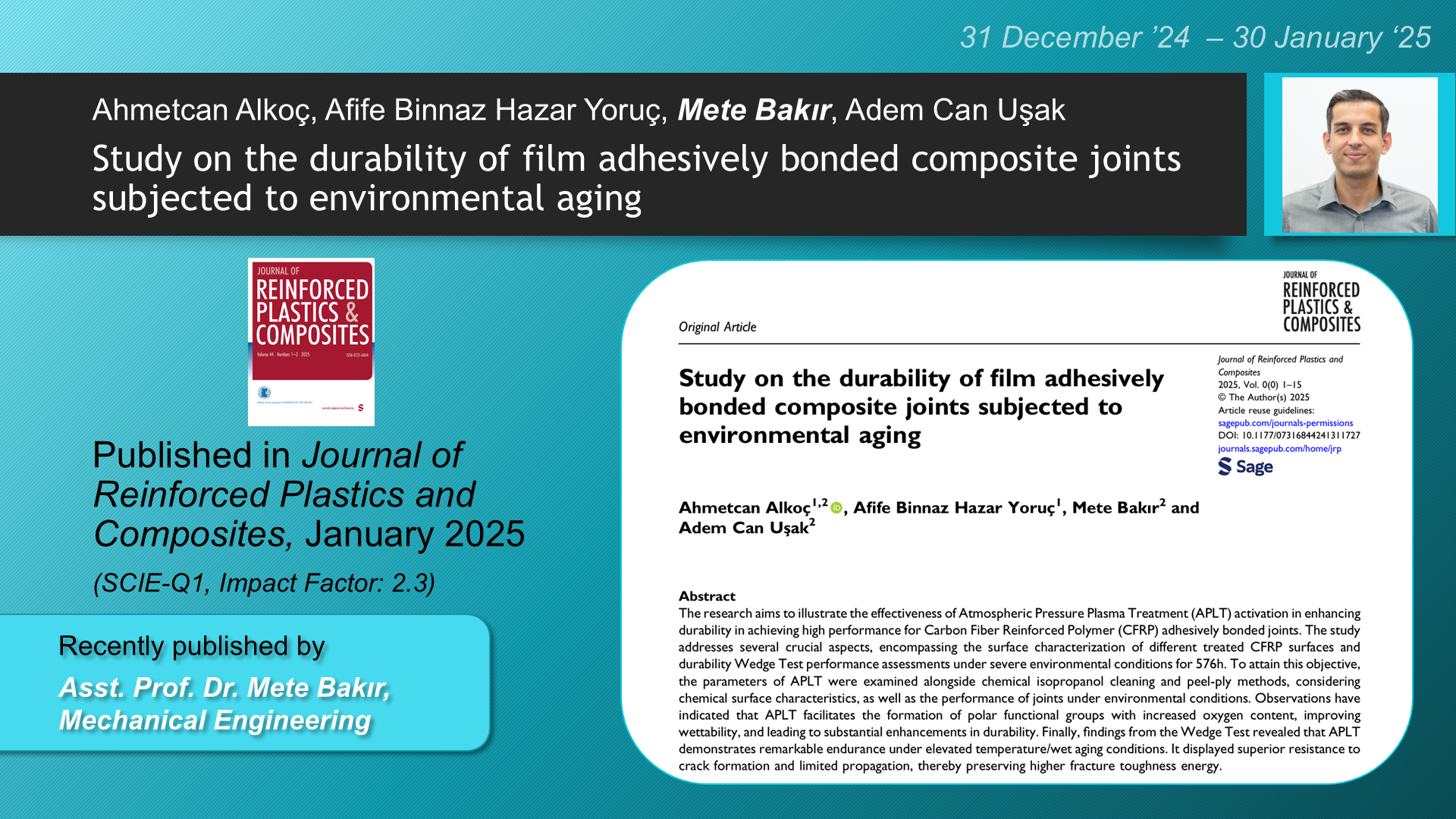 Biomedical Materials & Devices Study on the durability of film adhesively bonded composite joints subjected to environmental aging Ahmetcan Alkoç and Afife Binnaz Hazar Yoruç and Mete Bakır and Adem Can Uşak