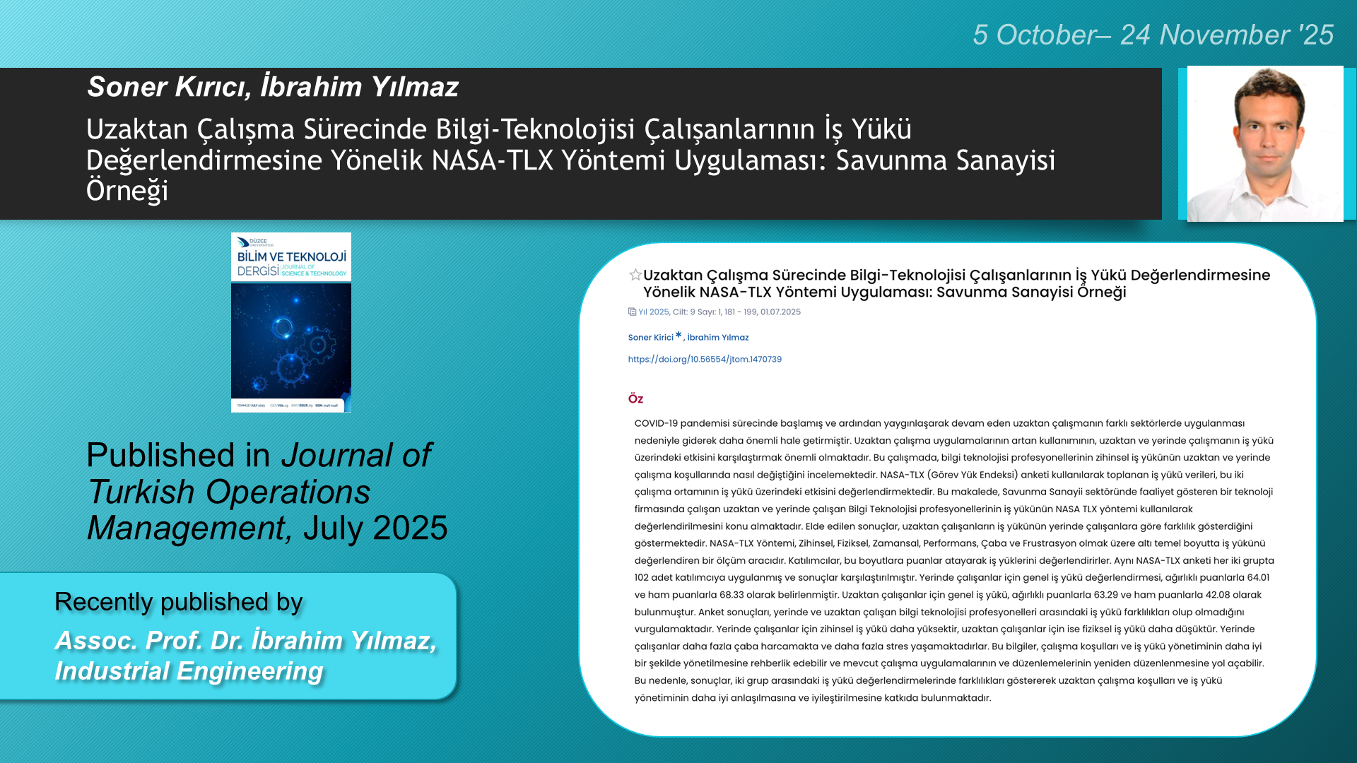 Information Sciences, Sayfalar 122841 Uzaktan Çalışma Sürecinde Bilgi-Teknolojisi Çalışanlarının İş Yükü Değerlendirmesine Yönelik NASA-TLX Yöntemi Uygulaması: Savunma Sanayisi Örneği SONER KIRICI and İBRAHİM YILMAZ
