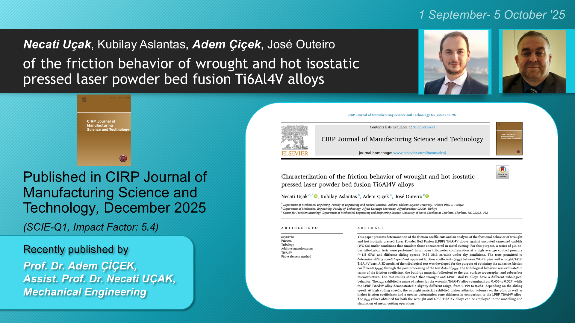 Manufacturing Letters, Cilt 44, Sayfalar 622-630 Characterization of the friction behavior of wrought and hot isostatic pressed laser powder bed fusion Ti6Al4V alloys Necati Uçak and Kubilay Aslantas and Adem Çiçek and José Outeiro
