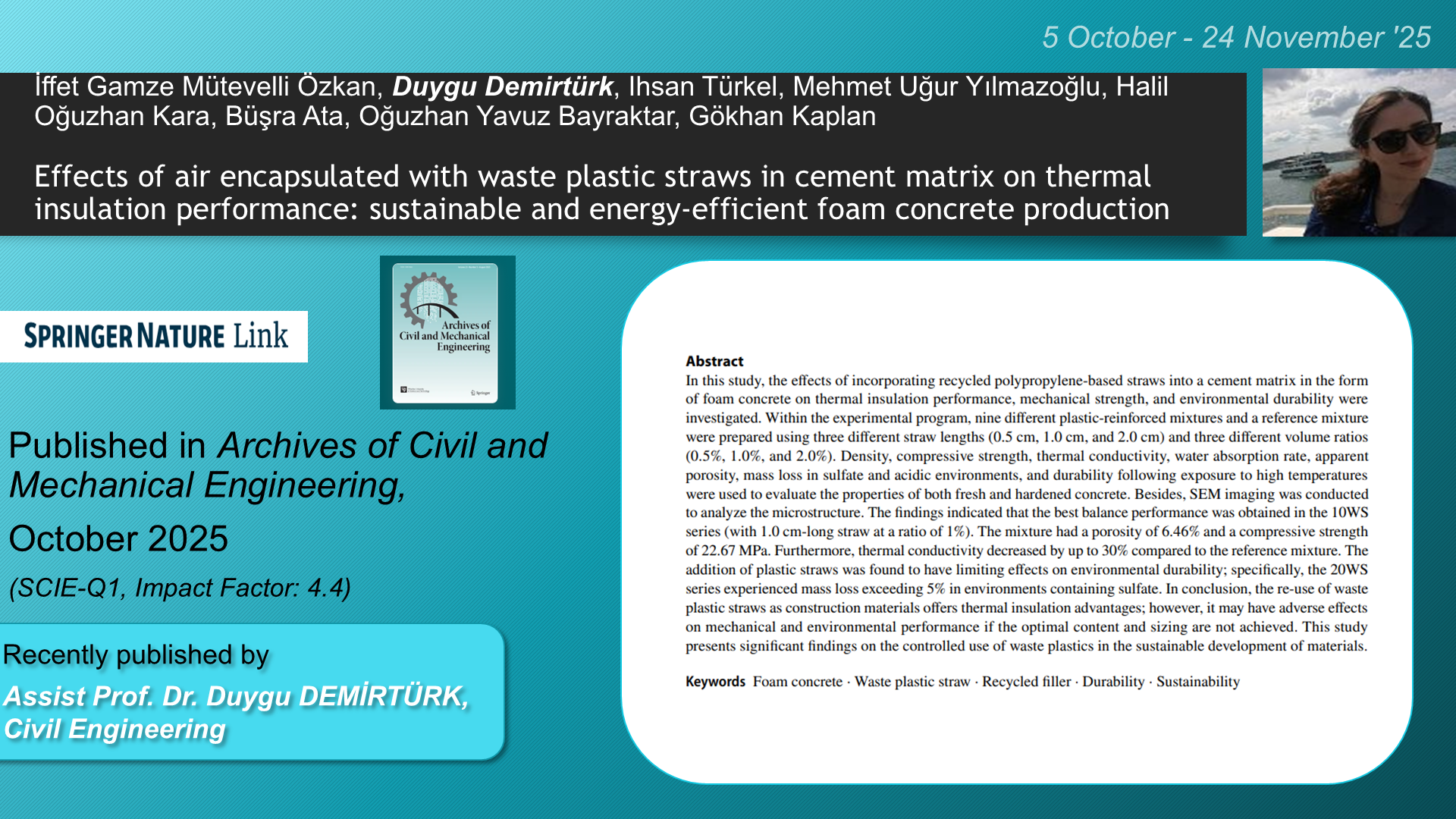 Asia Ocenia Geosciences Society, AOGS2025 Effects of air encapsulated with waste plastic straws in cement matrix on thermal insulation performance: sustainable and energy-efficient foam concrete production İffet Gamze Mütevelli Özkan and Duygu Demirtürk and Ihsan Türkel and Mehmet Uğur Yılmazoğlu and Halil Oğuzhan Kara and Büşra Ata and Oğuzhan Yavuz Bayraktar and Gökhan Kaplan