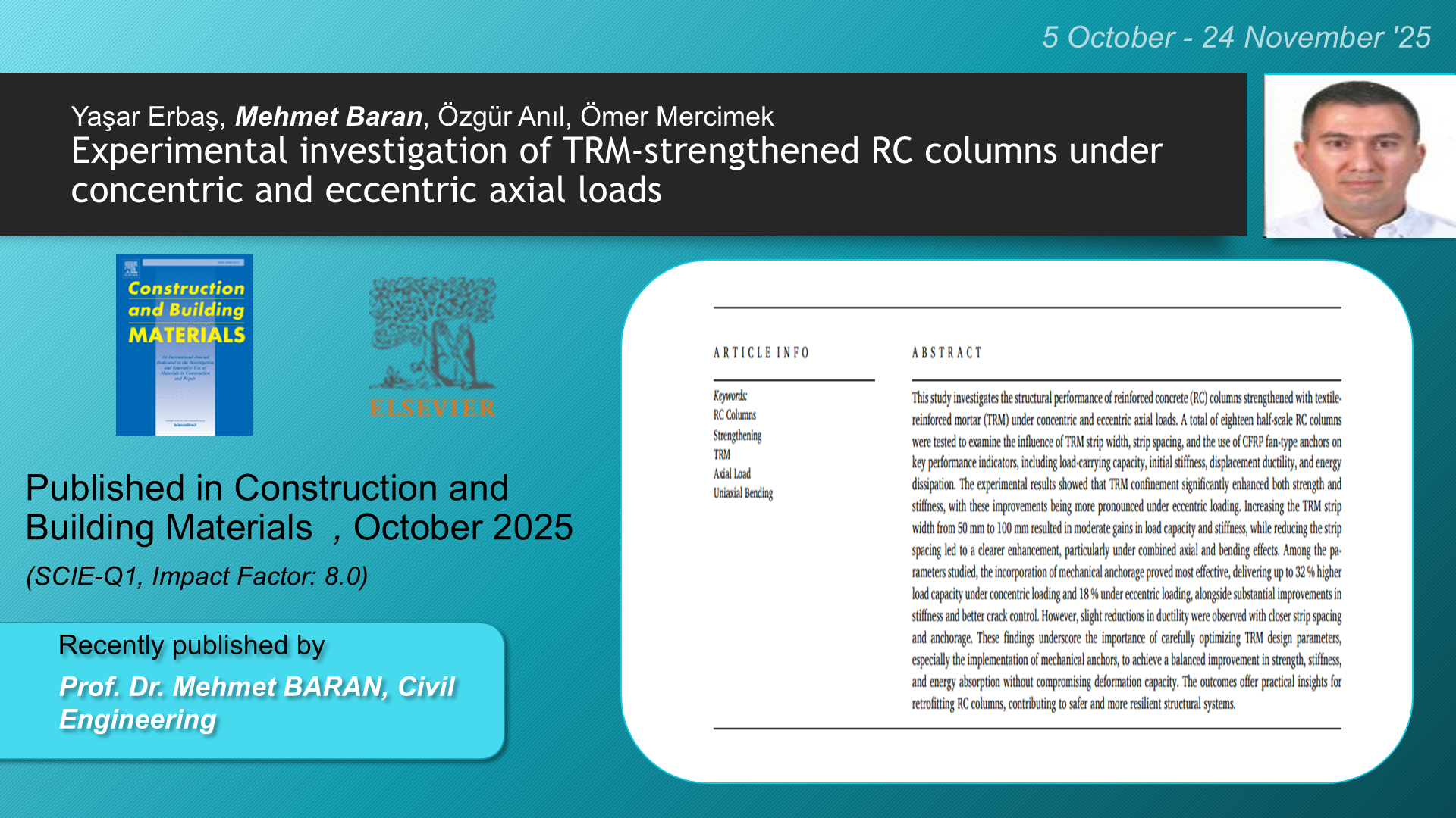 Scientific Reports, Cilt 15, Sayı 1, Sayfalar 38573 Experimental investigation of TRM-strengthened RC columns under concentric and eccentric axial loads Yaşar Erbaş and Mehmet Baran and Özgür Anıl and Ömer Mercimek