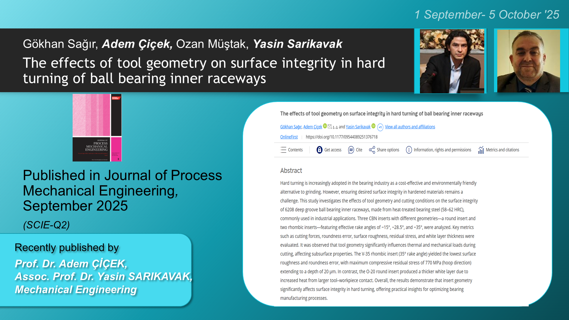 Journal of Cleaner Production, Cilt 524, Sayfalar 146473 The effects of tool geometry on surface integrity in hard turning of ball bearing inner raceways Gökhan Sağır and Adem Çiçek and Ozan Müştak and Yasin Sarikavak