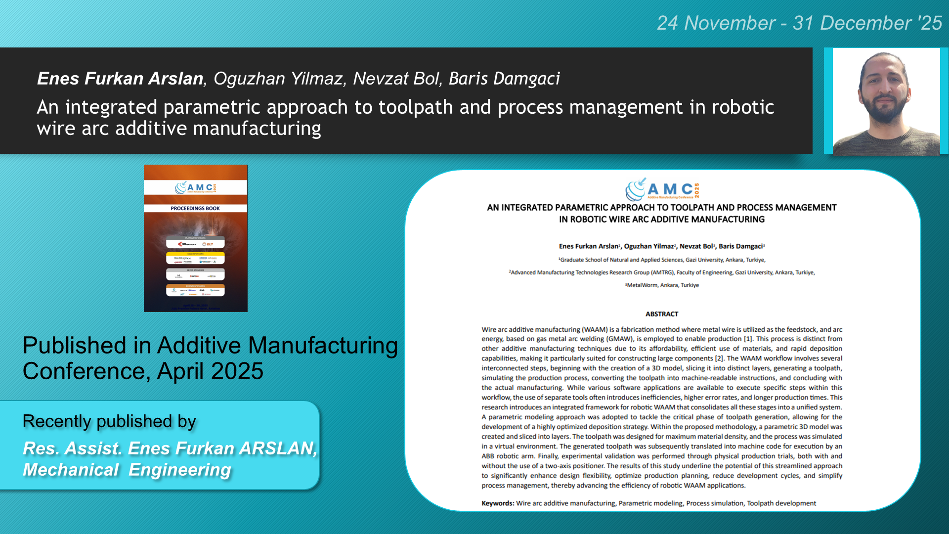 Scientific Reports, Cilt 15, Sayı 1, Sayfalar 42312 Robotik tel ark eklemeli imalat yönteminde parametrik modelleme yaklaşımıyla takım yolu geliştirilmesi ENES FURKAN Arslan AN INTEGRATED PARAMETRIC APPROACH TO TOOLPATH AND PROCESS MANAGEMENT IN ROBOTIC WIRE ARC ADDITIVE MANUFACTURING EF Arslan and O Yilmaz and Nevzat BOL and DAMGACI BARIŞ