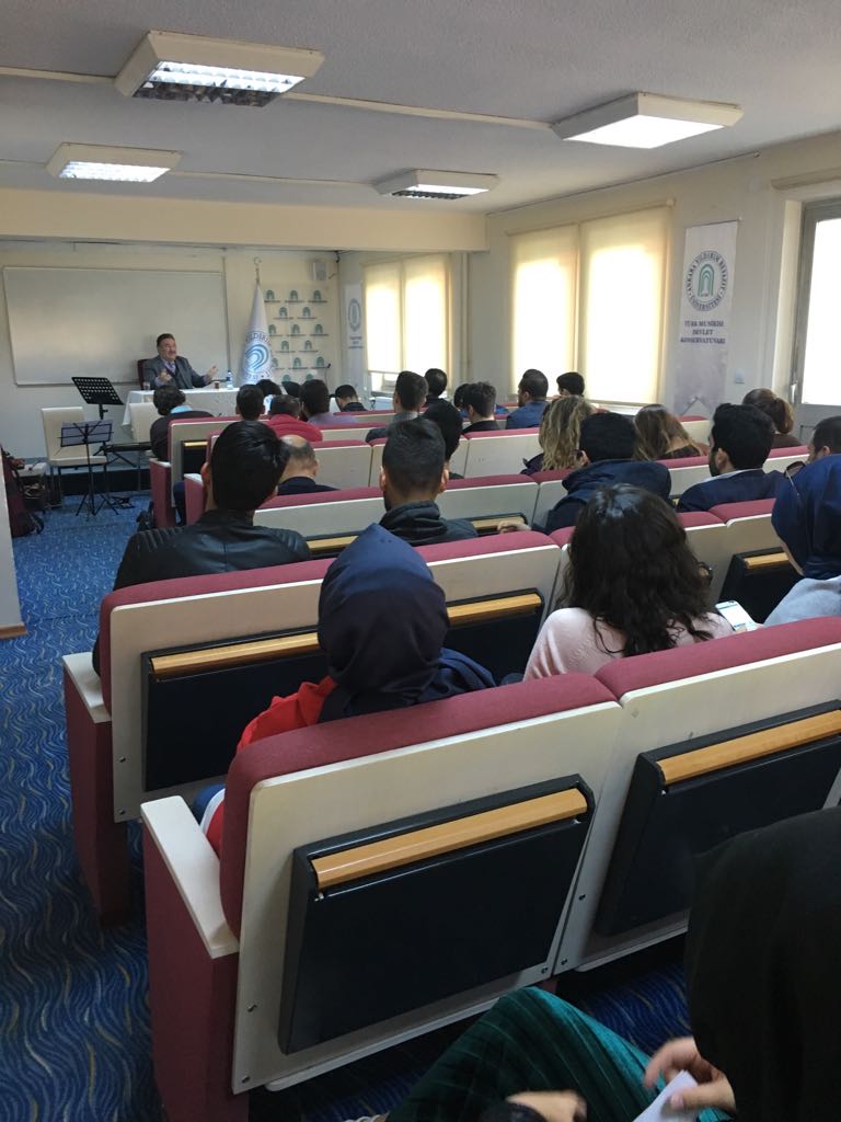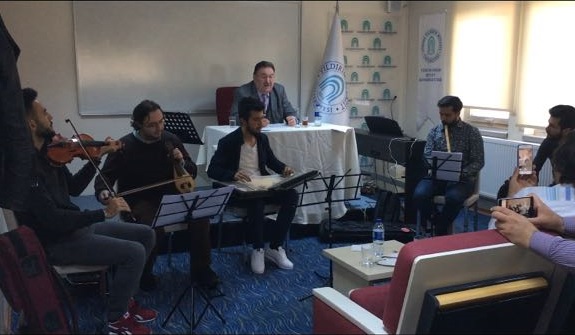 Ülkemizin tanınmış mevlidhan, kasidehanlarından Bilal DEMİRYÜREK, konservatuvarımız tarafından tertip edilen Lisân-ı Elhân sohbet etkinliğimize katıldı. Konservatuvarımız öğrencimerinden Muammer ELİYATKIN koordinatörlüğünde gerçekleşen programın açış konuşmasını Konservatuvarımız Müdür Yardımcısı Yrd. Doç. Dr. Serbülend ARPA yaptı. Yrd. Doç. Dr. S. ARPA, Türkiye'de geleneksel anlamda mevlid okuyucularının içinde Bilal DEMİRYÜREK'in önemli bir yerinin olduğunu, tecrübe ve birikimlerinden Konservatuvarımız öğrencilerinin azami ölçüde yararlanması gerektiğini, mevlid kültürünün ülkemizde azalma eğiliminde olduğunu, bu geleneğimizin gelecek kuşaklara aktarılmasında Konservatuvarımız üzerine büyük bir rolün düştüğünü ifade etti. Mevlidin tarihi süreci hakkında bilgi veren konuğumuz Bilal DEMİRYÜREK, mevlid okumaları konusunda tavrın önemine işaret etti. Geleneksel mevlid okumalarında hangi makamların ve geçkilerin kullanılması gerektiği hususunda bilgiler veren DEMİRYÜREK, mevlid bahirlerinden kısa örnekler verdi. İlgiyle takip edilen programda Bilal DEMİRYÜREK ayrıca kaside ve ezan okumaları konusunda da geleneksel tavır örnekleri verdi. İki saate yakın süren sohbet programına konservatuvar hocalarımız da dinleyici olarak katıldı. Program, Konservatuvarımız Müdür Yardımcısı Yrd. Doç. Dr. Serbülend ARPA'nın çiçek takdimi ve öğrencilerle birlikte toplu resim çektirmeyle sona erdi.