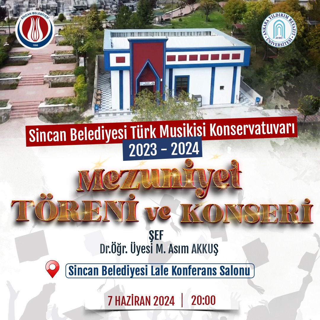 KONSERVATUVARIMIZ VE SİNCAN BELEDİYESİ PROTOKOLİ İLE KURULAN SİNCAN BELEDİYESİ TÜRK MUSİKİSİ KONSERVATUVARIN 2023 - 2024 MEZUNİYET TÖRENİ VE MEZUNİYET KONSERİ 07 HAZİRAN 2024 TARİHİNDE YAPILACAKTIR.