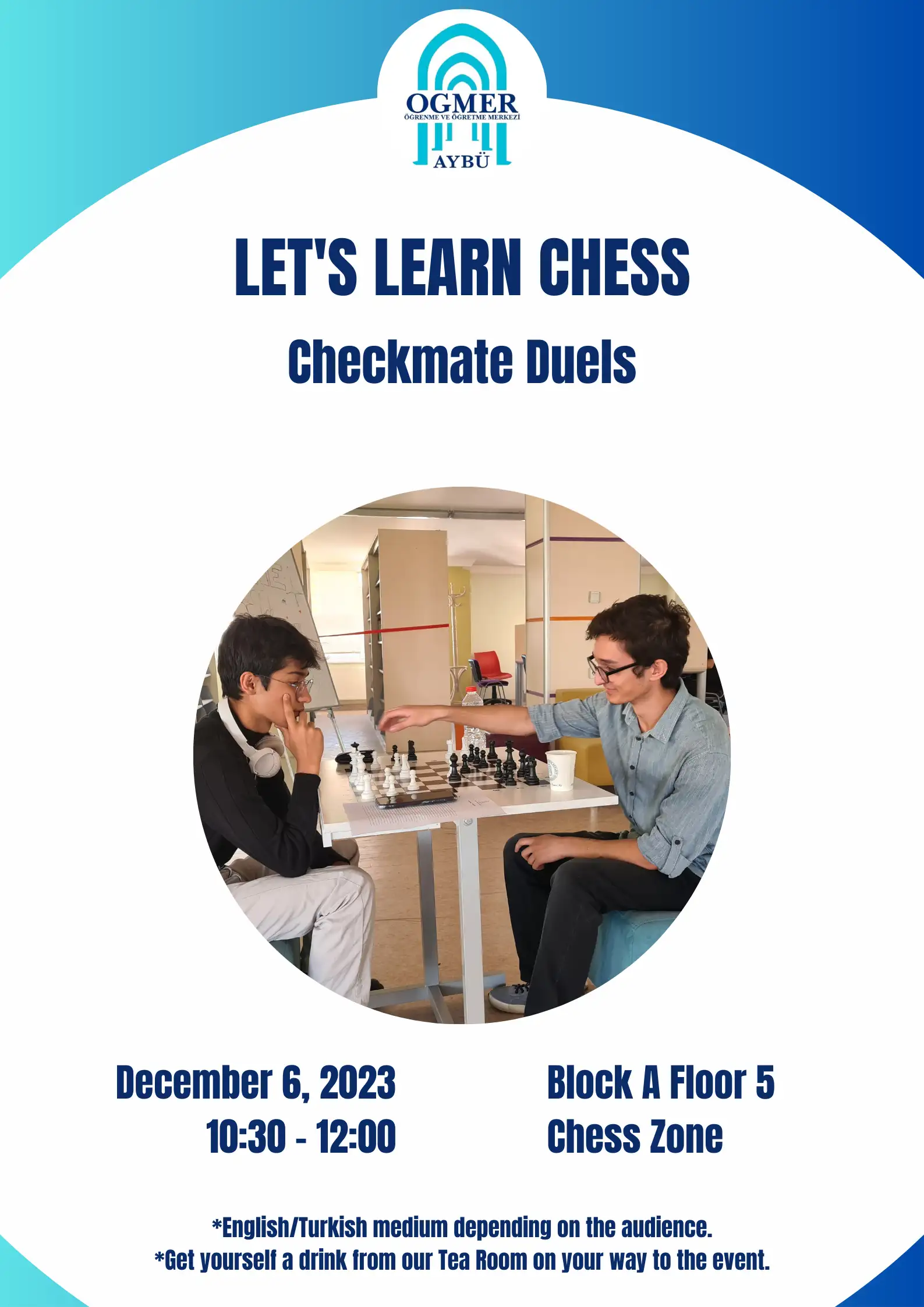 ÖĞMER Öğrenci Mentörlüğü Programı 6 Aralık 2023 Çarşamba günü saat 10.30-12.00 arasında merkezimizde satranç severleri buluşturuyor! Etkinlik kapsamında İngilizce hazırlık sınıfı öğrencilerimiz Salih TOKER, Berkay KURT, Yusuf TİCE ve Ali Haydar SUCU satranç oyununun tarihini ve temel hamlelerini anlatacaklar; ardından oynayacağımız satranç maçlarına rehberlik edecekler!
