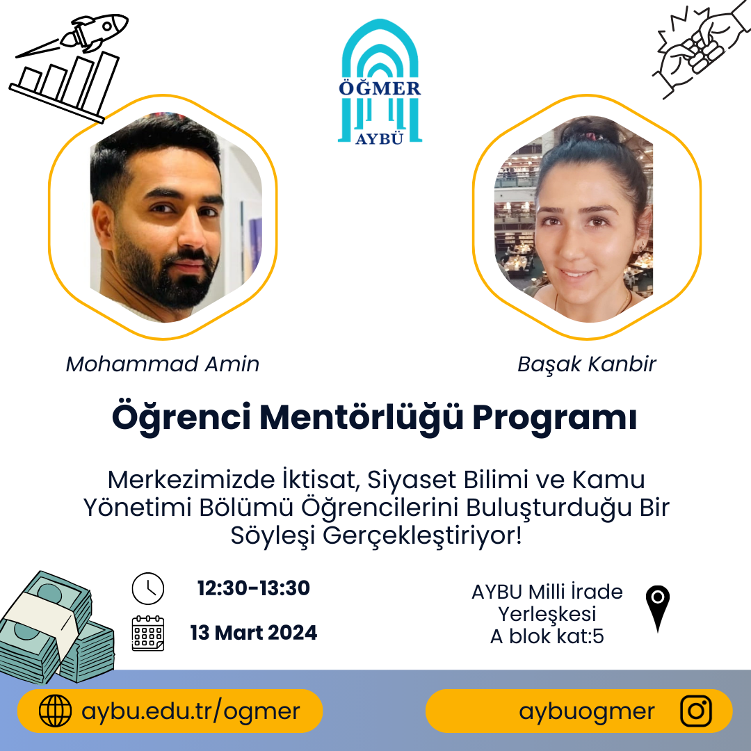 ÖĞMER Öğrenci Mentörlüğü Programı, 13 Mart 2024 Çarşamba 12:30-13:30 arasında merkezimizde İktisat, Siyaset Bilimi ve Kamu Yönetimi Bölümü öğrencilerini buluşturduğu bir söyleşi gerçekleştiriyor! 4. sınıf öğrencimiz Başak Kanbir ve doktora öğrencimiz Mohammad Amin üniversitemizde ilk yılında olan İngilizce hazırlık sınıfı öğrencilerimizin sorularını yanıtlıyor.