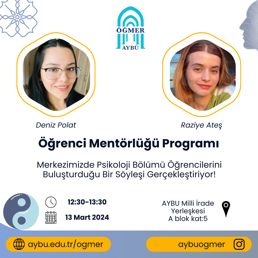 ÖĞMER Öğrenci Mentörlüğü Programı, 13 Mart 2024 Çarşamba 12:30-13:30 arasında merkezimizde Psikoloji Bölümü öğrencilerini buluşturduğu bir söyleşi gerçekleştiriyor! 2. Sınıf öğrencilerimiz Deniz Polat ve Raziye Ateş üniversitemizde ilk yılında olan İngilizce hazırlık sınıfı öğrencilerimizin sorularını yanıtlıyor.