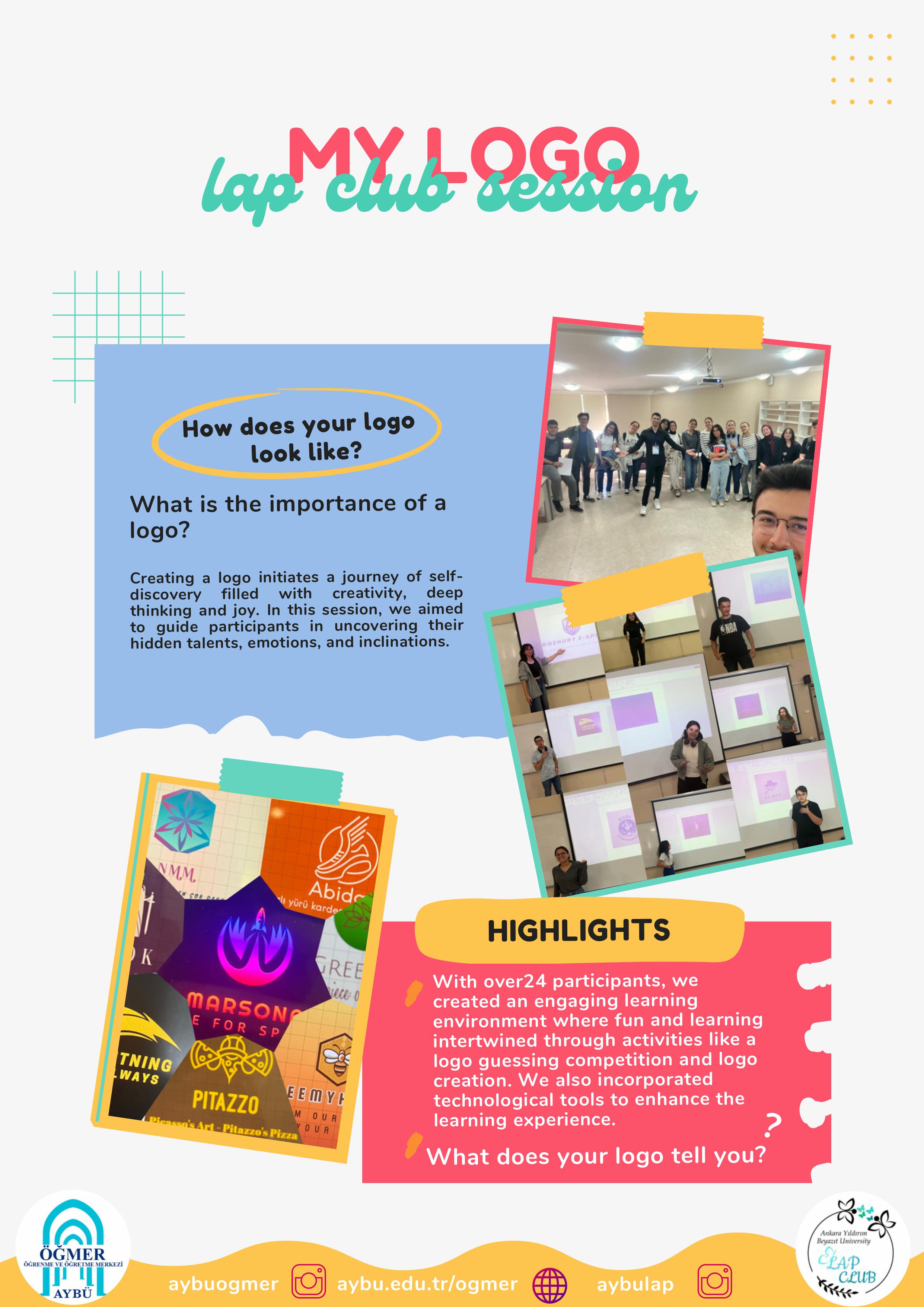 Ahmed Cevher tarafından yönetilen My Logo oturumu 9 Eylül 2024 tarihinde AYBÜ ÖĞMER'de gerçekleşti. 24'ün üzerinde katılımcı ile Logo'nun önemini ve uygulamalarını keşfettik. Katılımcıların öz farkındalıklarını artırmak ve kendilerini keşfetme yolculuklarını teşvik etmek için çeşitli aktivitelere yer verdik.