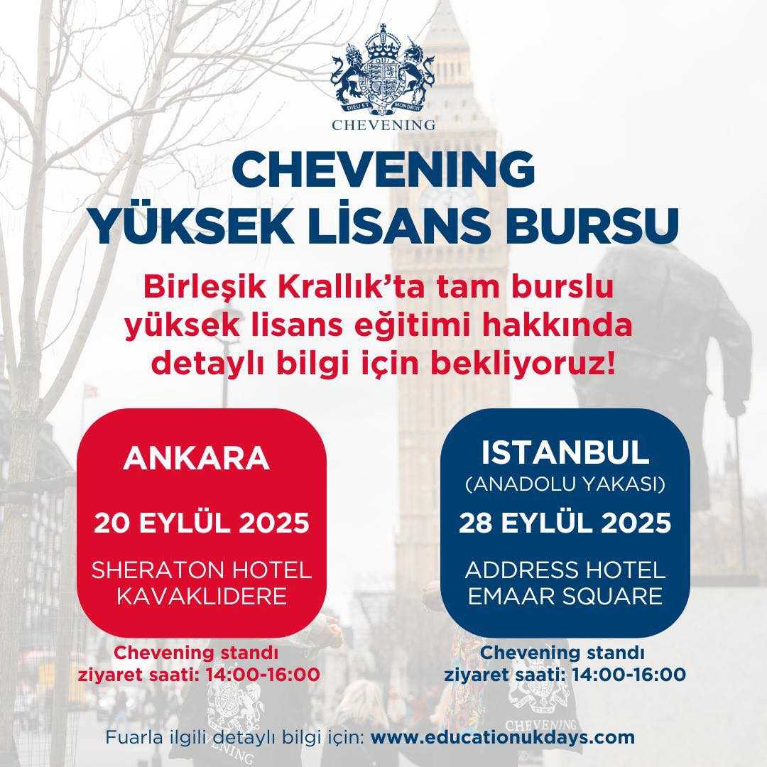 Birleşik Krallık Hükümeti Dışişleri, Milletler Topluluğu ve Kalkınma Bakanlığı tarafından finanse edilen "Chevening Yüksek Lisans Burs Programı"na 2026-2027 Akademik Yılı için başvurular 7 Ekim 2025 tarihi saat 12:00'ye (GMT) kadar devam edecektir.