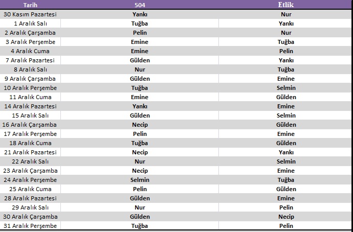 Aralık Ayı Nöbet Listesi
