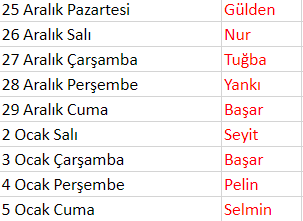 Final Haftası Nöbet Listesi