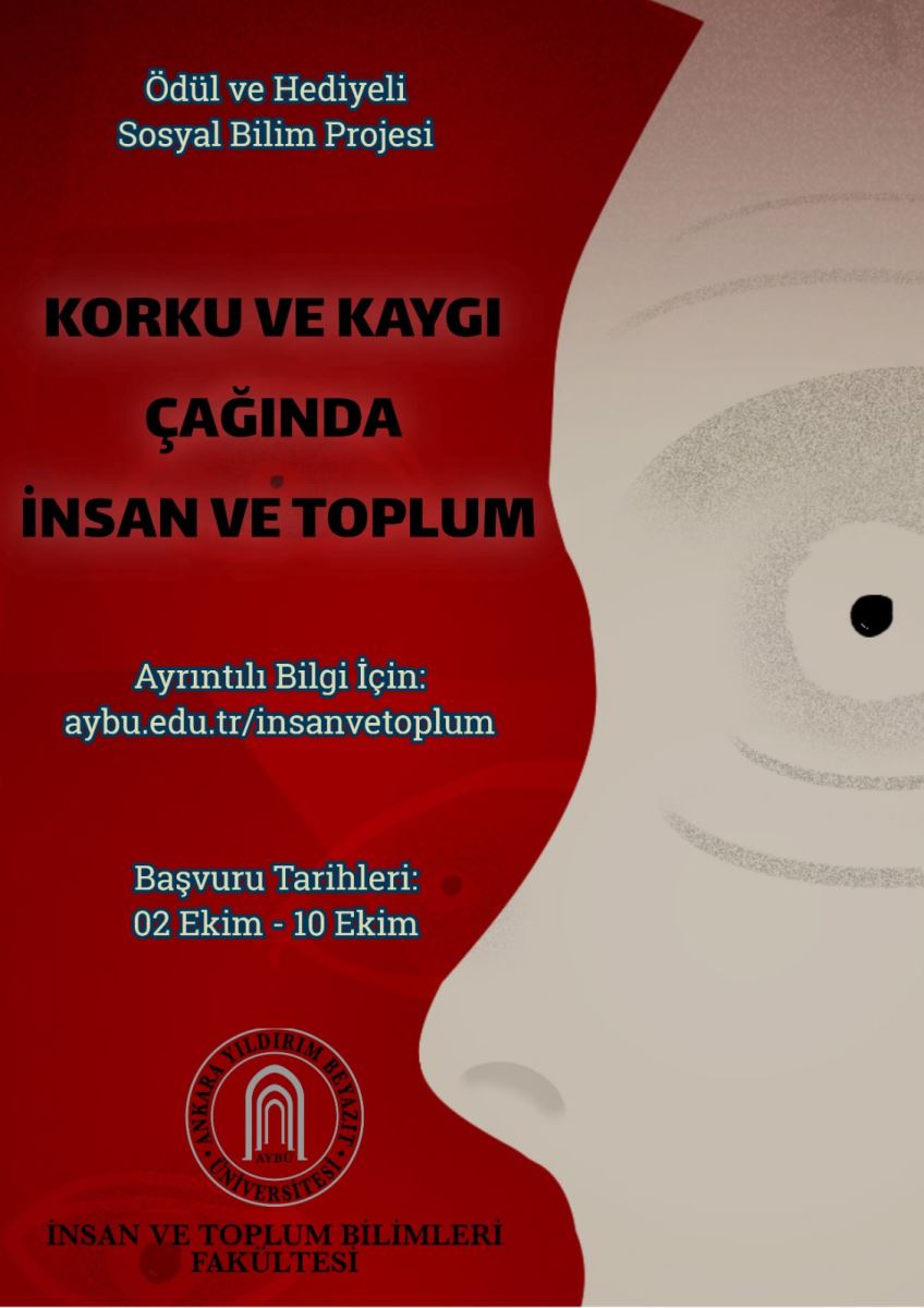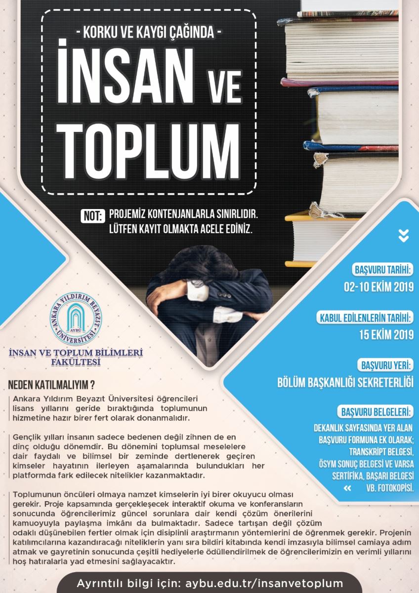 Ankara Yıldırım Beyazıt Üniversitesi mesleki eğitimin gerçekleştirildiği bir kurum olmanın yanı sıra çağın gerçekliğini idrak eden, insanlığın sorunlarına dair çözümler üreten bir düşünce merkezi olma hedefindedir. İnsan ve Toplum Bilimleri Fakültesi, bünyesindeki alt alanları sayesinde sahip olduğu entelektüel birikim, akademik personel ve öğrencileriyle birlikte bu yönde çalışmaları organize edecek kabiliyet ve sorumluluğa sahiptir. Lisans Öğrencileri İçin Akademik Eğitim ve Gelişim Projesi’nin “Korku ve Kaygı Çağında İnsan ve Toplum” teması kapsamında fakültenin başarılı öğrencilerinin günümüz sorunlarına dair farkındalığını arttırmak, öğrencileri geliştirici etkinlikler düzenlemek ve kamuoyu ile paylaşılabilecek eserlerin ortaya konulması hedeflenmektedir. Okuma grupları, alanında uzman kişilerin düşünsel serüvenlerini paylaşacakları konferanslar, bir sempozyum ve nihayetinde bir bildiri kitabı ile hem sivil toplumun hem de akademik camianın faydalanabileceği kapsamlı bir program amaçlanmaktadır. Üniversitemizin eğitim politikasına uygun biçimde öğrencilerimizin aktif katılımının sağlandığı proje doğrultusunda sadece ülkemizin değil, tüm insanlığın ve çevrenin yaşadığı dramatik problemler hakkında entelektüel bir ilgi oluşturulacaktır.