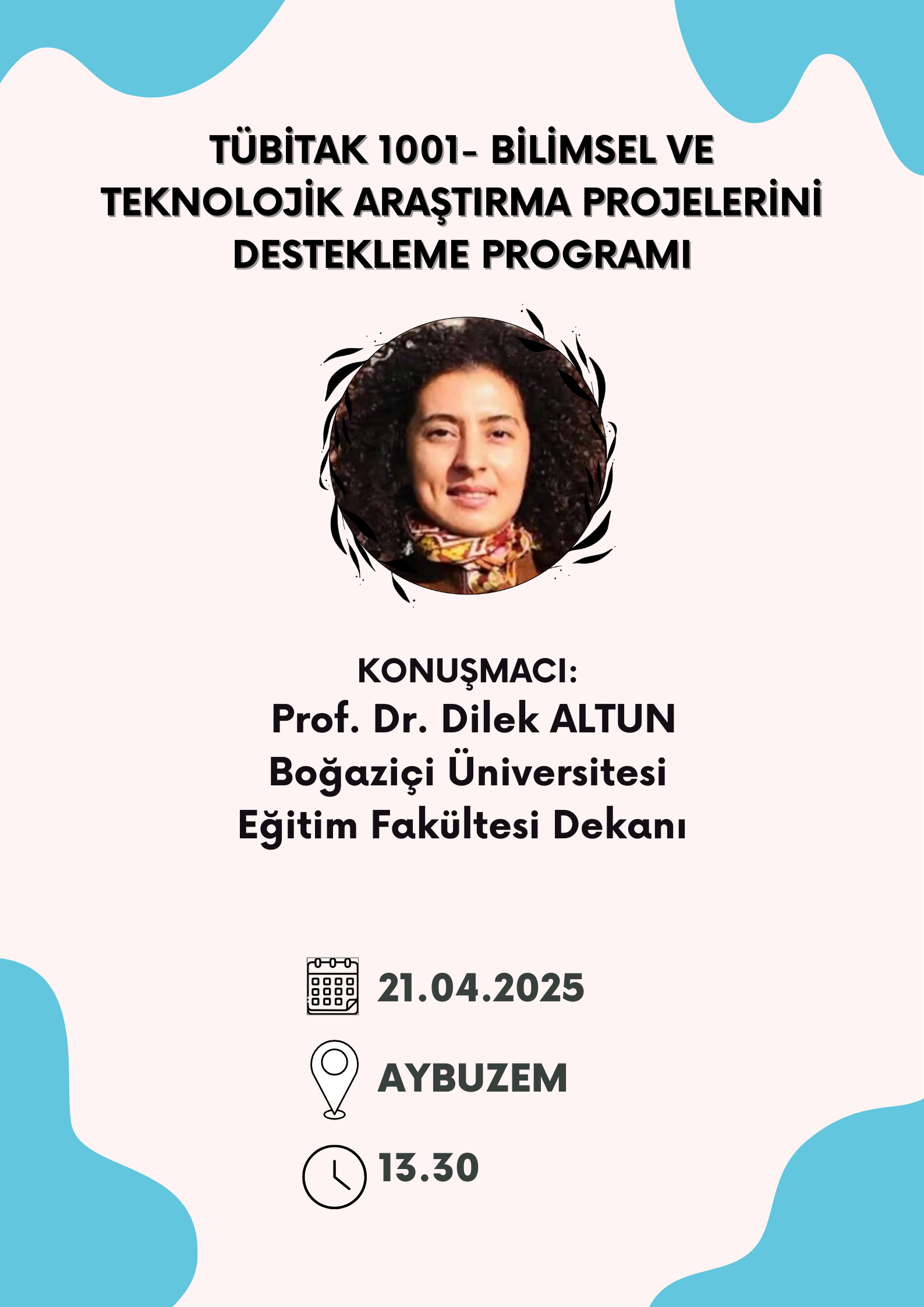 Akademisyenlerimizin bilimsel araştırma ve geliştirme faaliyetlerinin kalitesinin artırılması amacıyla Dekanlığımız tarafından düzenlenen Proje Yazma Eğitimleri kapsamında 21 Nisan 2025 Pazartesi günü saat 13.30’da Boğaziçi Üniversitesi Eğitim Fakültesi Dekanı Prof. Dr. Dilek ALTUN tarafından "TÜBİTAK 1001 - Bilimsel ve Teknolojik Araştırma Projelerini Destekleme Programı" hakkında öğretim elemanlarımıza bilgi verilecektir.