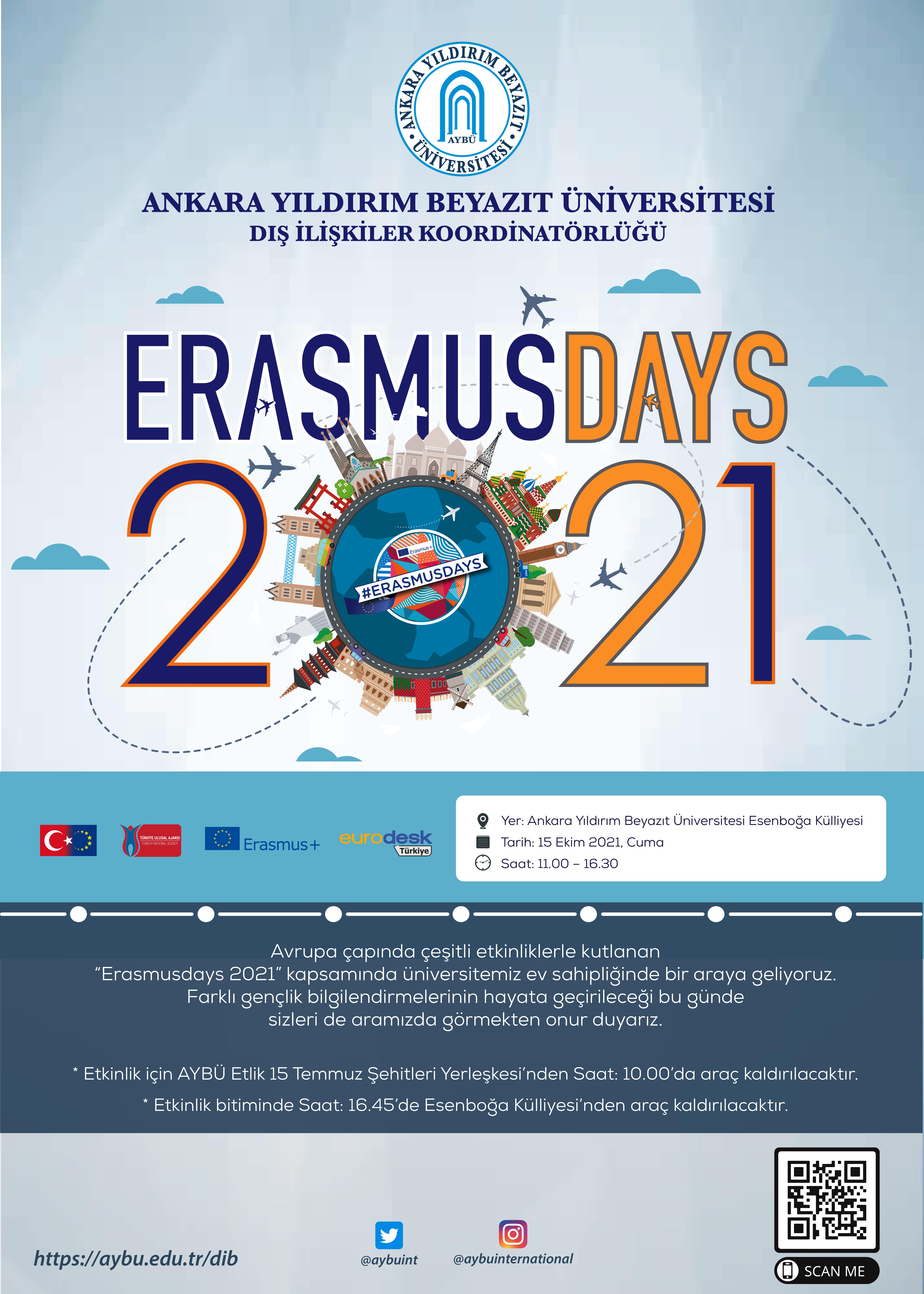 "ErasmusDays 2021" etkinliklerine Ankara'da bulunan konsorsiyum ortağı üniversiteler ve çok sayıda öğrencinin etkileşimine tanıklık etmek üzere çeşitli kurum ve kuruluşlar 15 Ekim 2021 Cuma günü, 11.00-16.30 saatleri arasında AYBÜ Esenboğa Kampüsü’nde bir araya gelecektir.