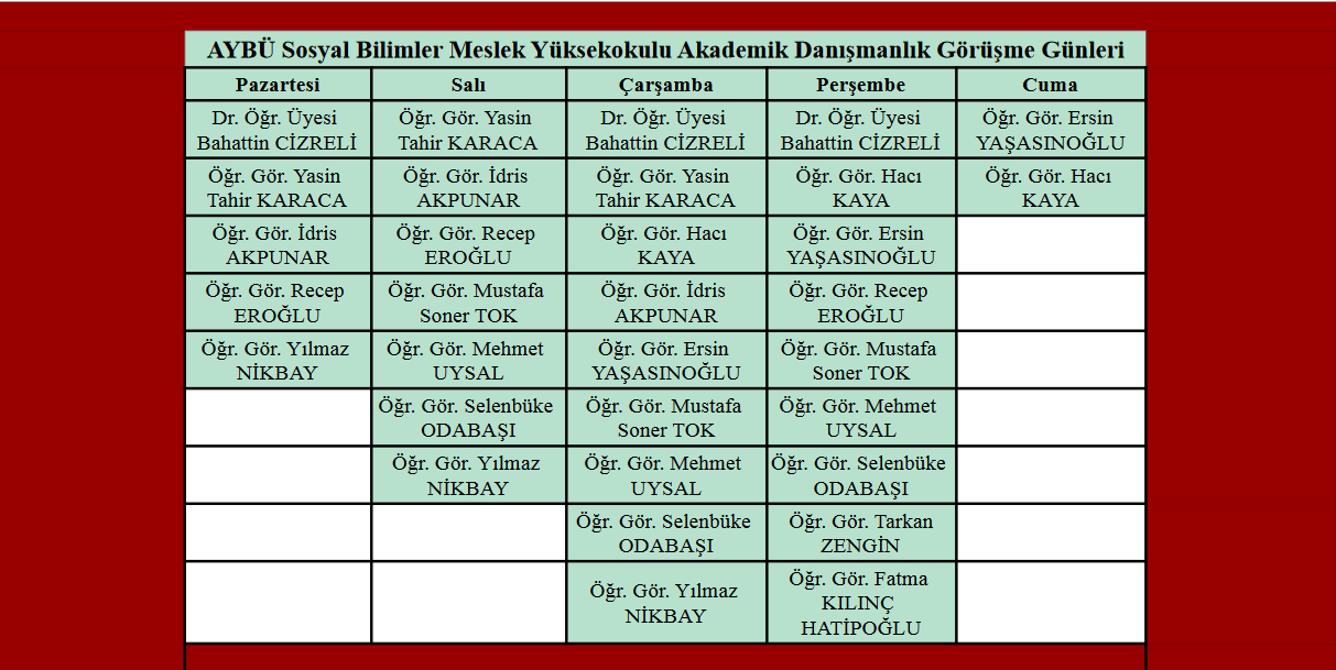 Yüksekokulumuzda görevli akademik personellerimizin görüşme günleri aşağıdaki tabloda belirtildiği gibidir. Öğrencilerimiz bu günlerde akademik personellerimizle görüşmek için öncesinde elektronik posta yoluyla randevu saati belirlemelidir. Öğretim elemanlarımızın elektronik posta adreslerine erişmek için buraya tıklayabilirsiniz.