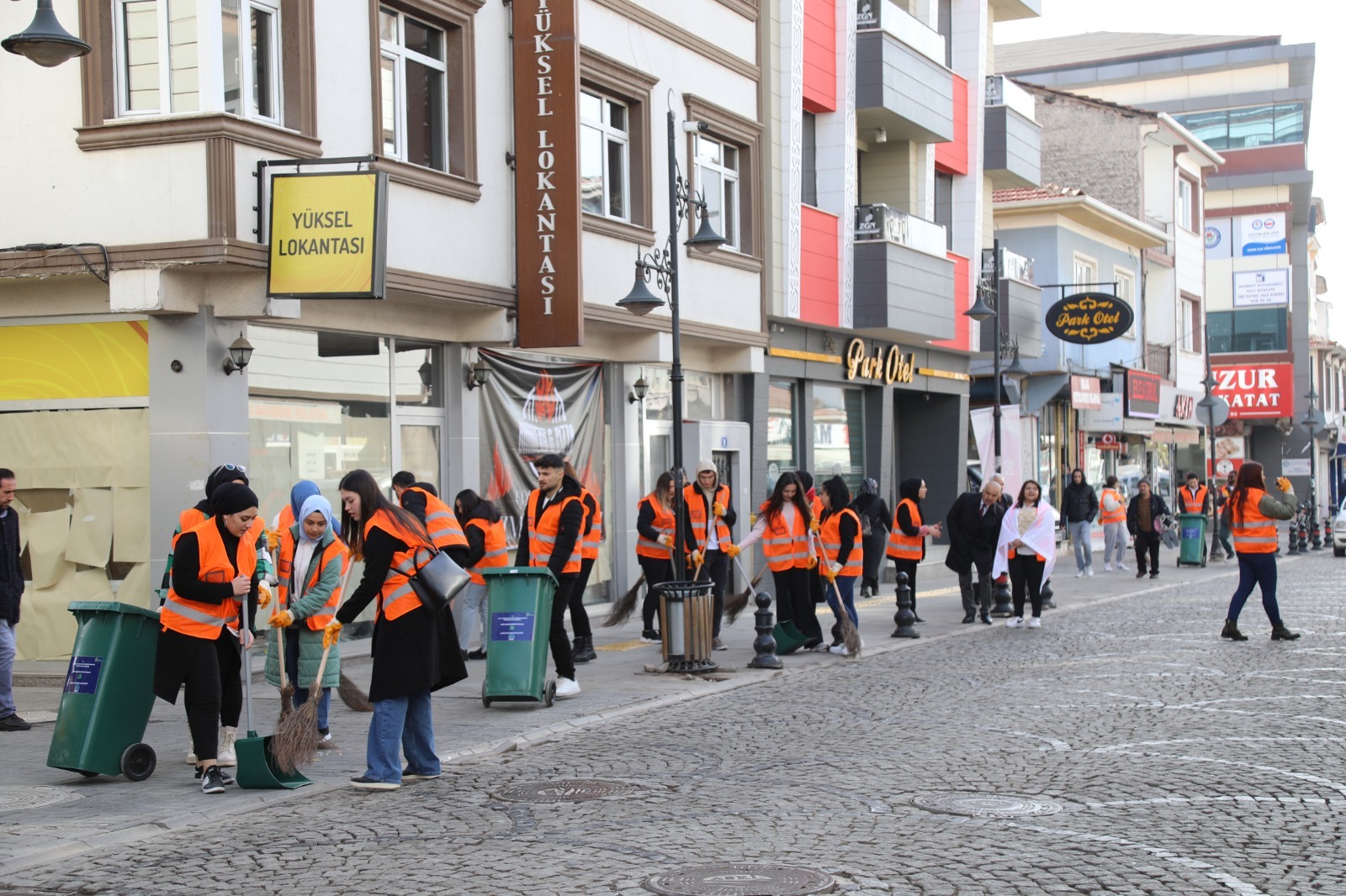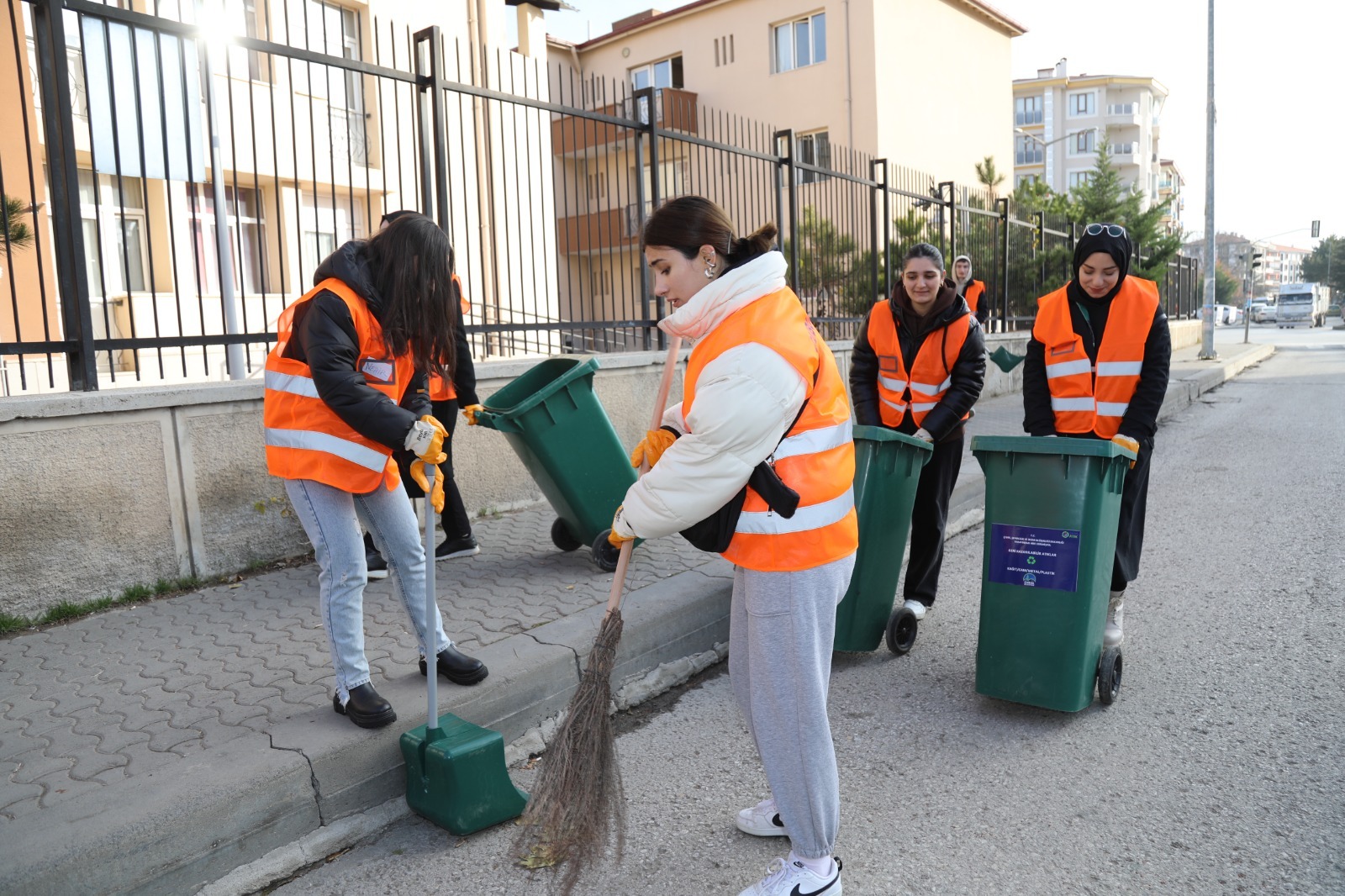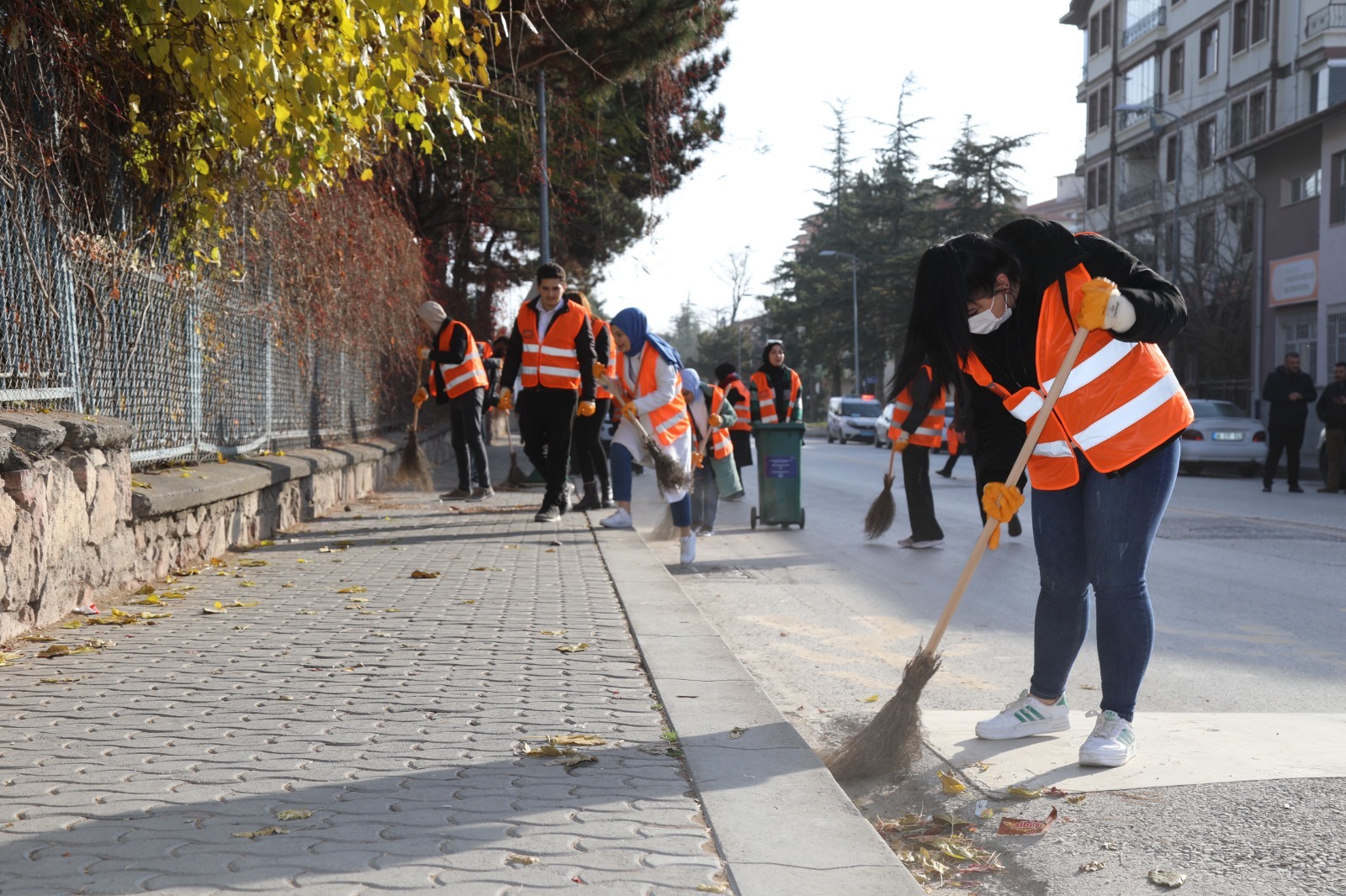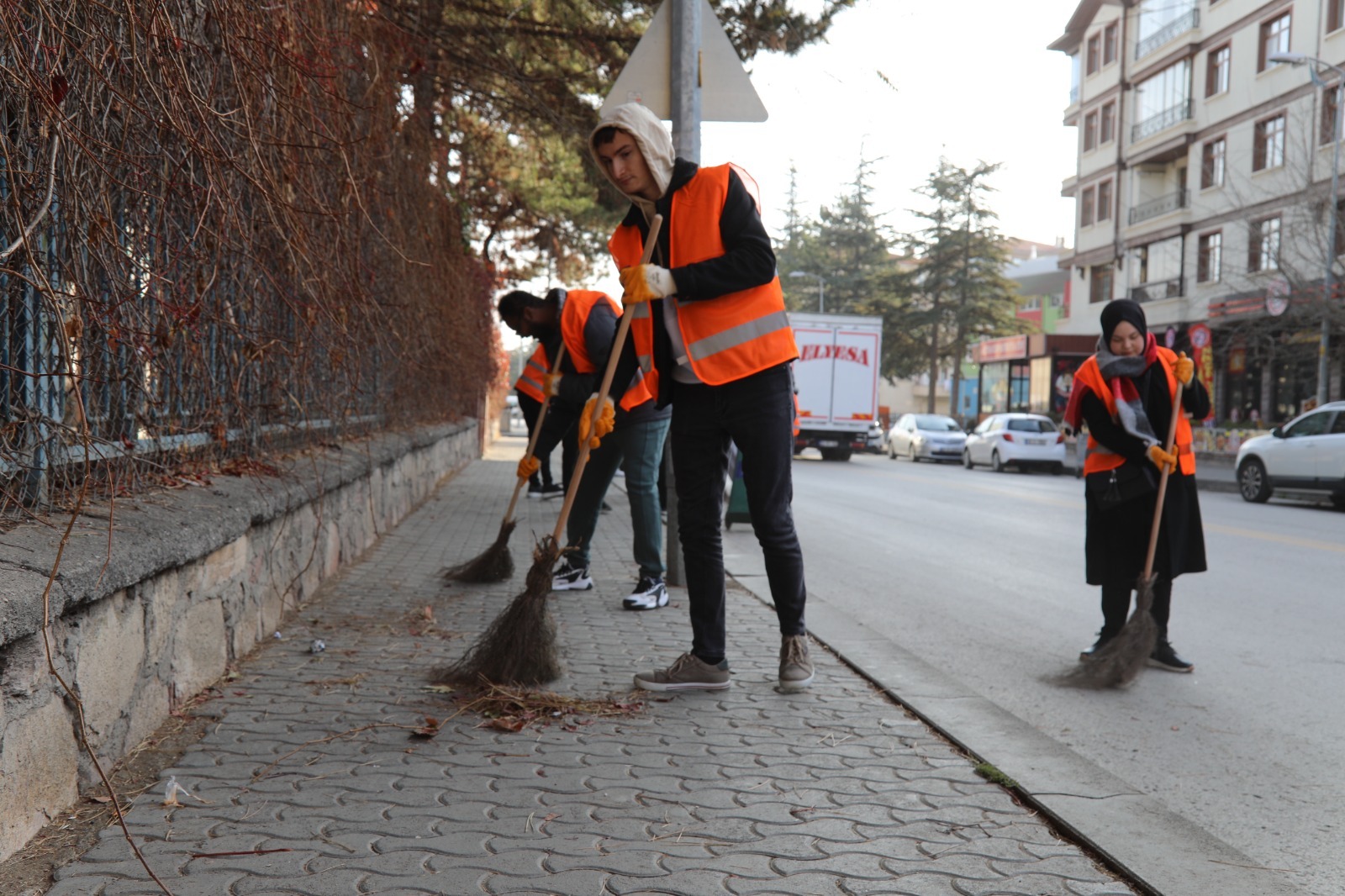 Eldiven takıp yelek giyen öğrenciler, süpürge ve küreklerle müzik eşliğinde cadde, sokak ve iş yerlerinin önü ile kaldırımları temizledi. Öğrenciler, yerlere izmarit ve çöp atanları da uyardı.