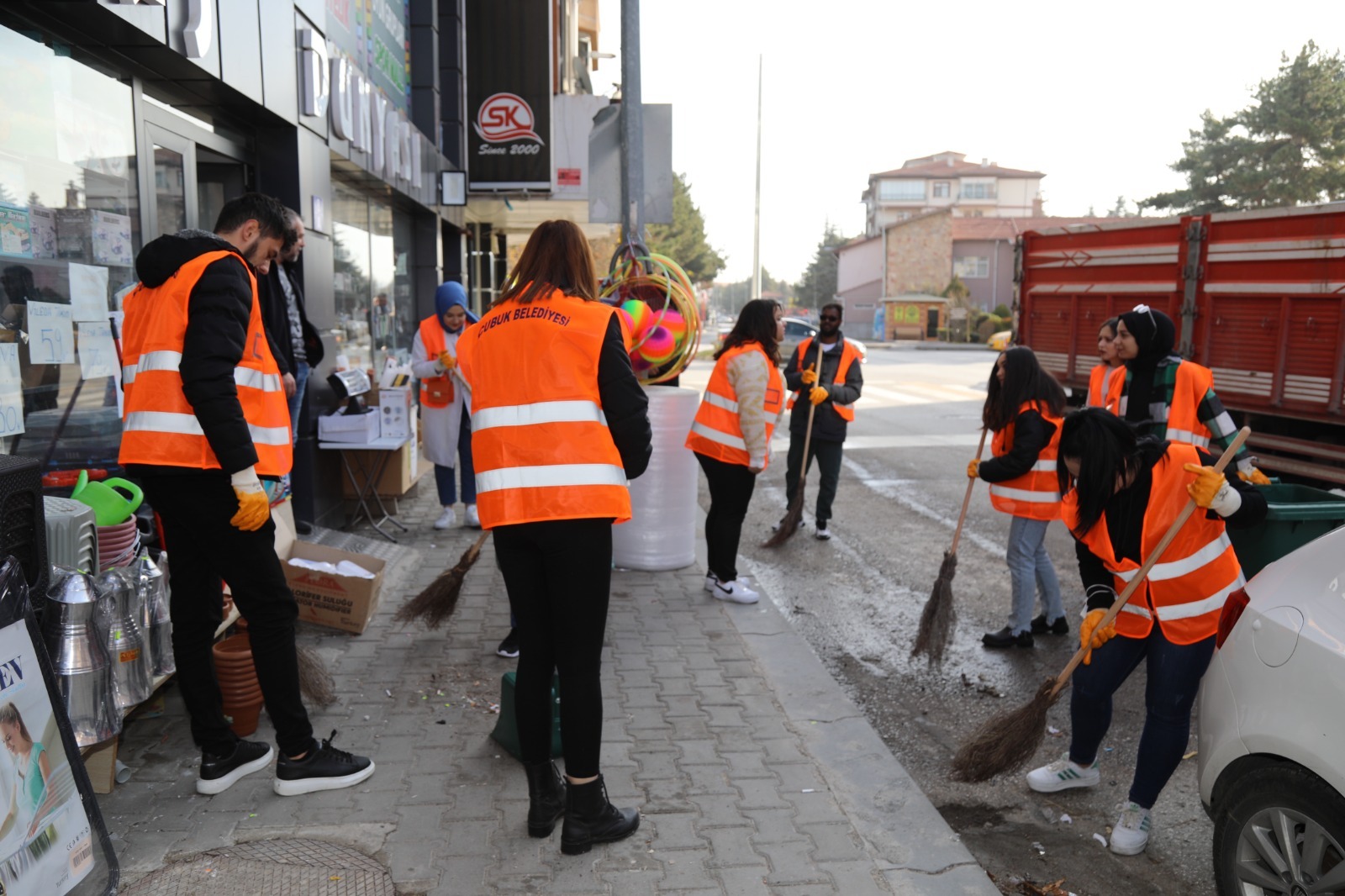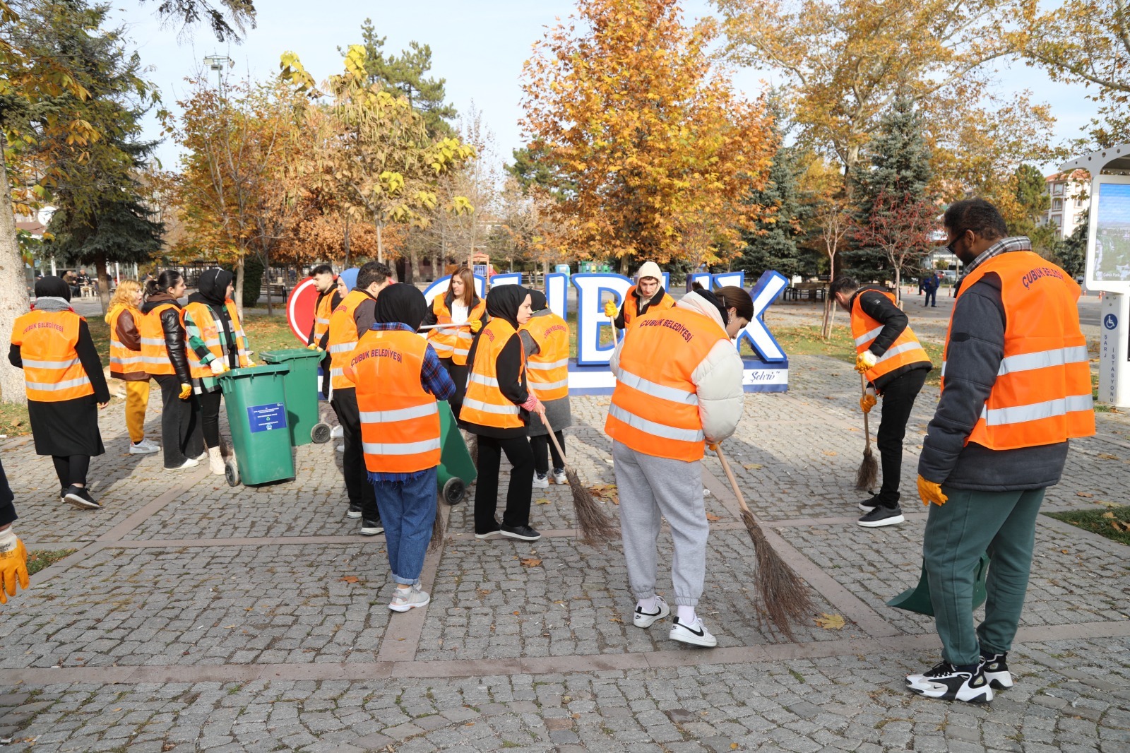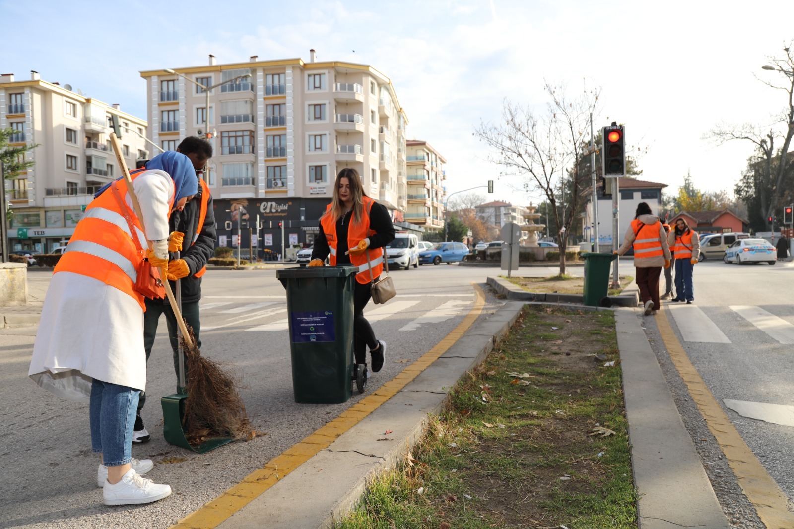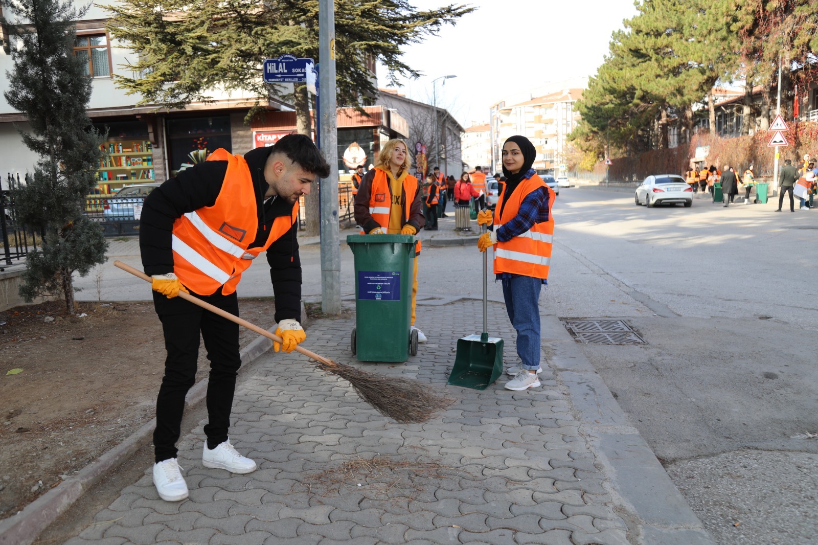 Eldiven takıp yelek giyen öğrenciler, süpürge ve küreklerle müzik eşliğinde cadde, sokak ve iş yerlerinin önü ile kaldırımları temizledi. Öğrenciler, yerlere izmarit ve çöp atanları da uyardı.