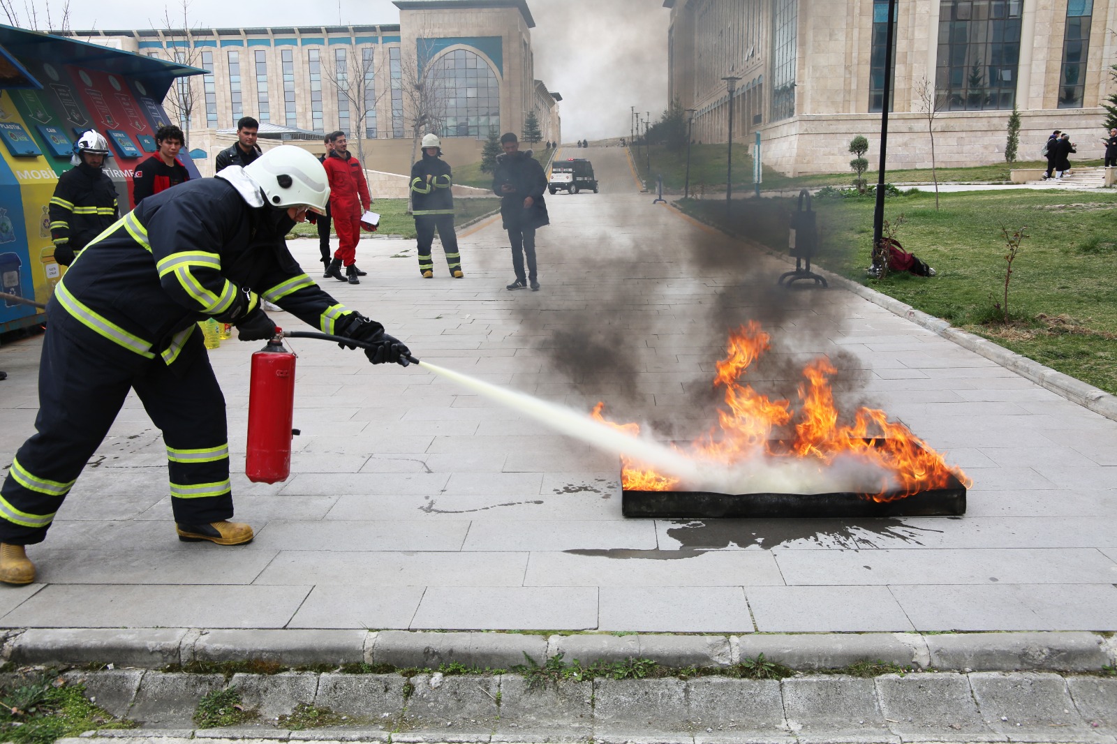 Eğitimin en dikkat çekici bölümlerinden biri ise dışarıda gerçekleştirilen yangın söndürme tatbikatıydı. Tatbikatta, sıvı yanıcı maddelerin söndürülmesi üzerine odaklanılarak, portatif yangın söndürme cihazlarının kullanımı uygulamalı olarak gösterildi. Öğrenciler, yangınla mücadelede etkili ve güvenli bir şekilde nasıl hareket edeceklerini uygulamalı olarak deneyimleme fırsatı buldular. Öğrencilerimize ve tatbikata alanında uzman öğretim görevlimiz Yasin Tahir Karaca rehberlik yaptı.