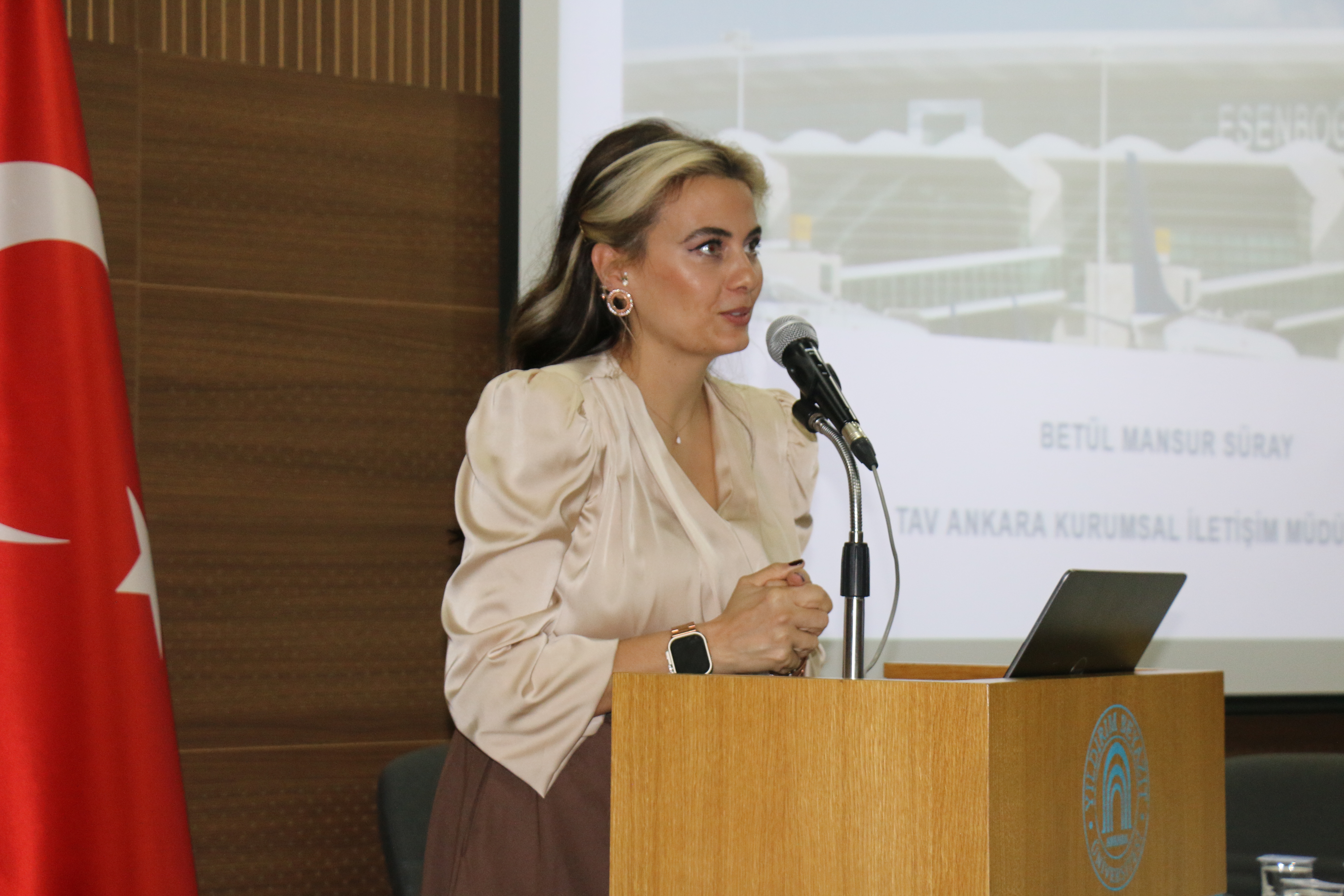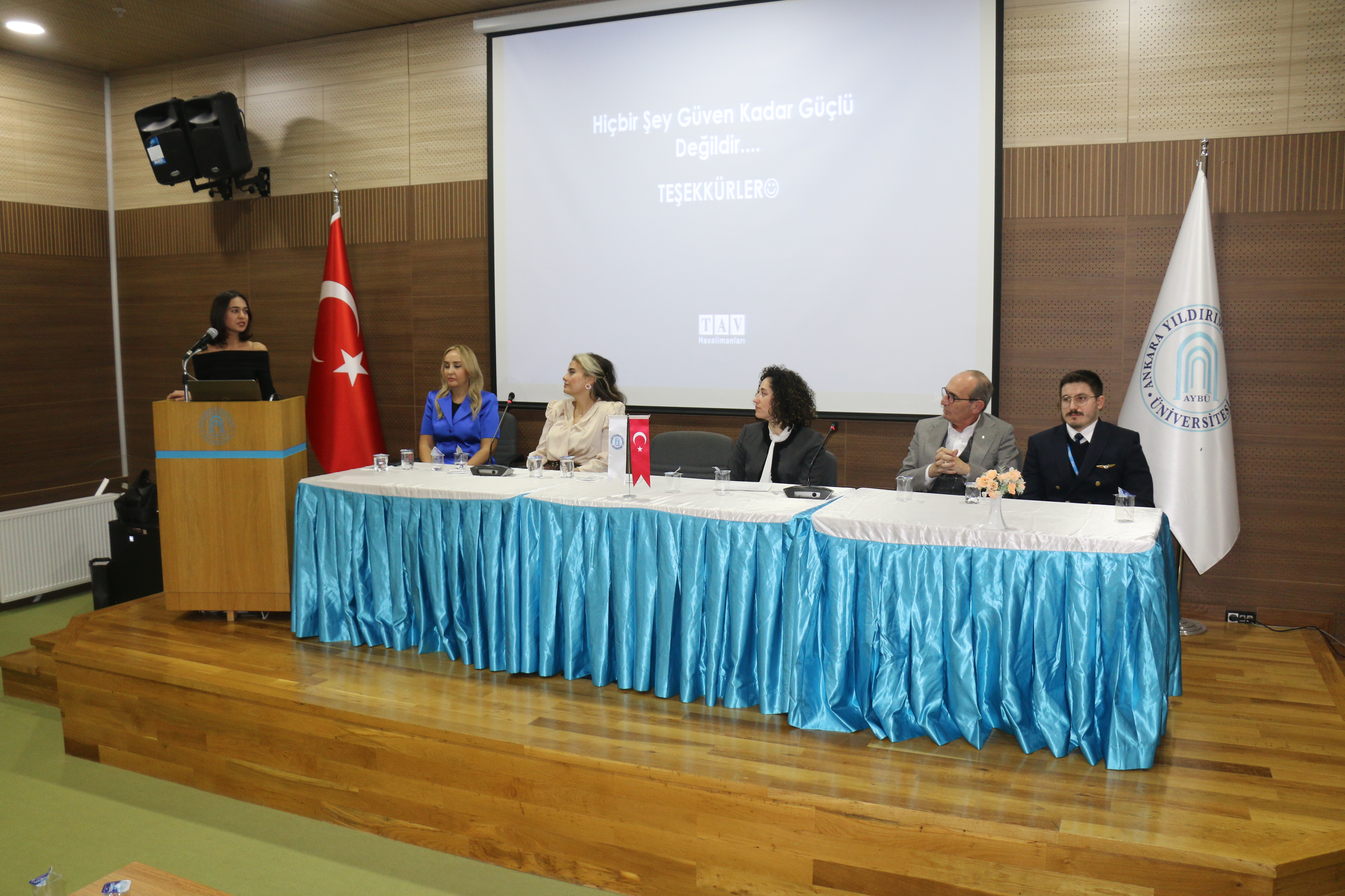 Türk Hava Yolları’nda Purser olarak görev yapan Didem Türkmen, kabin memurlarının güvenlik konularında oynadıkları kritik rolü anlatarak disiplinin ve sürekli öğrenmenin önemini vurguladı. TAV Esenboğa Havalimanı Kurumsal İletişim Müdürü Betül Süray ise havalimanı işletmeciliği ve güvenlik önlemlerinin gereklilik ve önemine dikkat çeken sunumuyla öğrencilerden büyük ilgi gördü. LİMAK Havacılık Kabin Amiri Burcu Kutbay da sektördeki zorluklar ve avantajlar üzerine yaptığı konuşmada, kariyeri boyunca yaşadığı ilginç deneyimleri bir ders niteliğinde sundu.