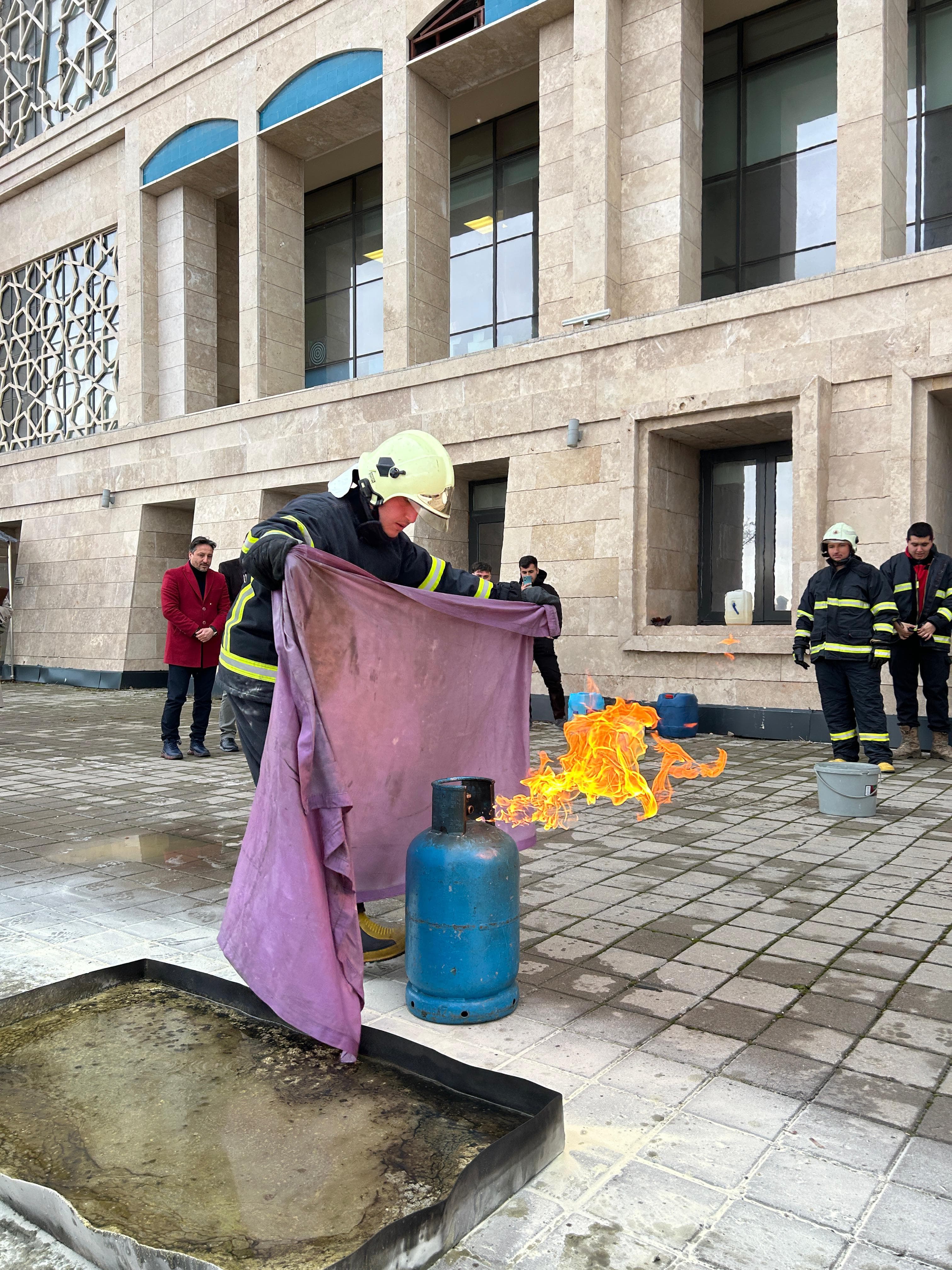 Eğitimin ardından AYBÜ Esenboğa Külliyesi Öğrenci Yemekhanesi önünde bir yangın tatbikatı gerçekleştirildi. Rektör Yardımcımız Prof. Dr. Mustafa Orçan ve katılımcılar, uzmanlar eşliğinde yangın söndürme cihazlarını kullanarak uygulamalı eğitim aldı. Ayrıca mutfak tüpü yangınlarına müdahale yöntemleri de gösterildi.