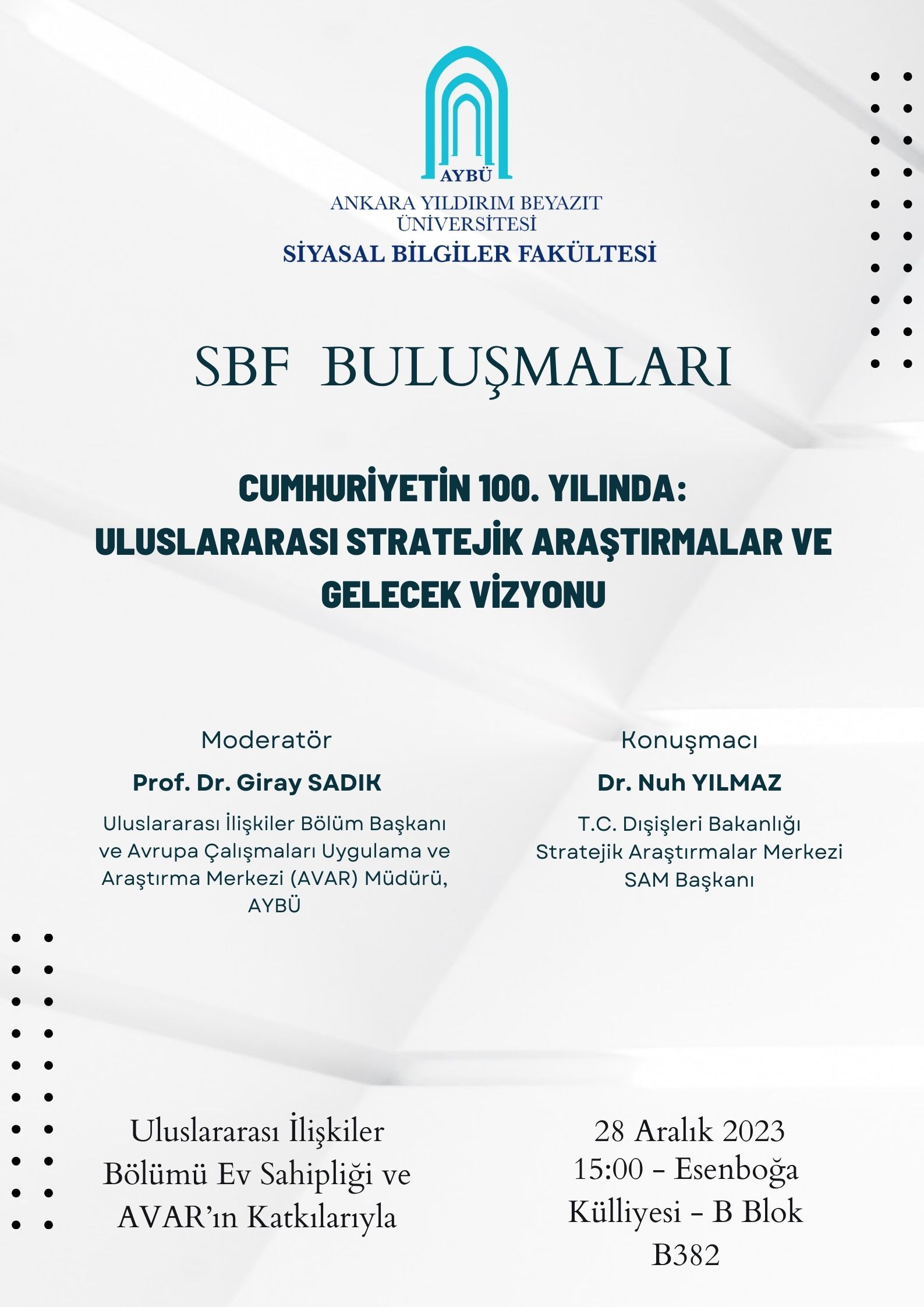 SBF Buluşmalarında “Cumhuriyetin 100. Yılında: Uluslararası Stratejik Araştırmalar ve Gelecek Vizyonu” adlı programımıza tüm personelimiz ve öğrencilerimiz davetlidir.