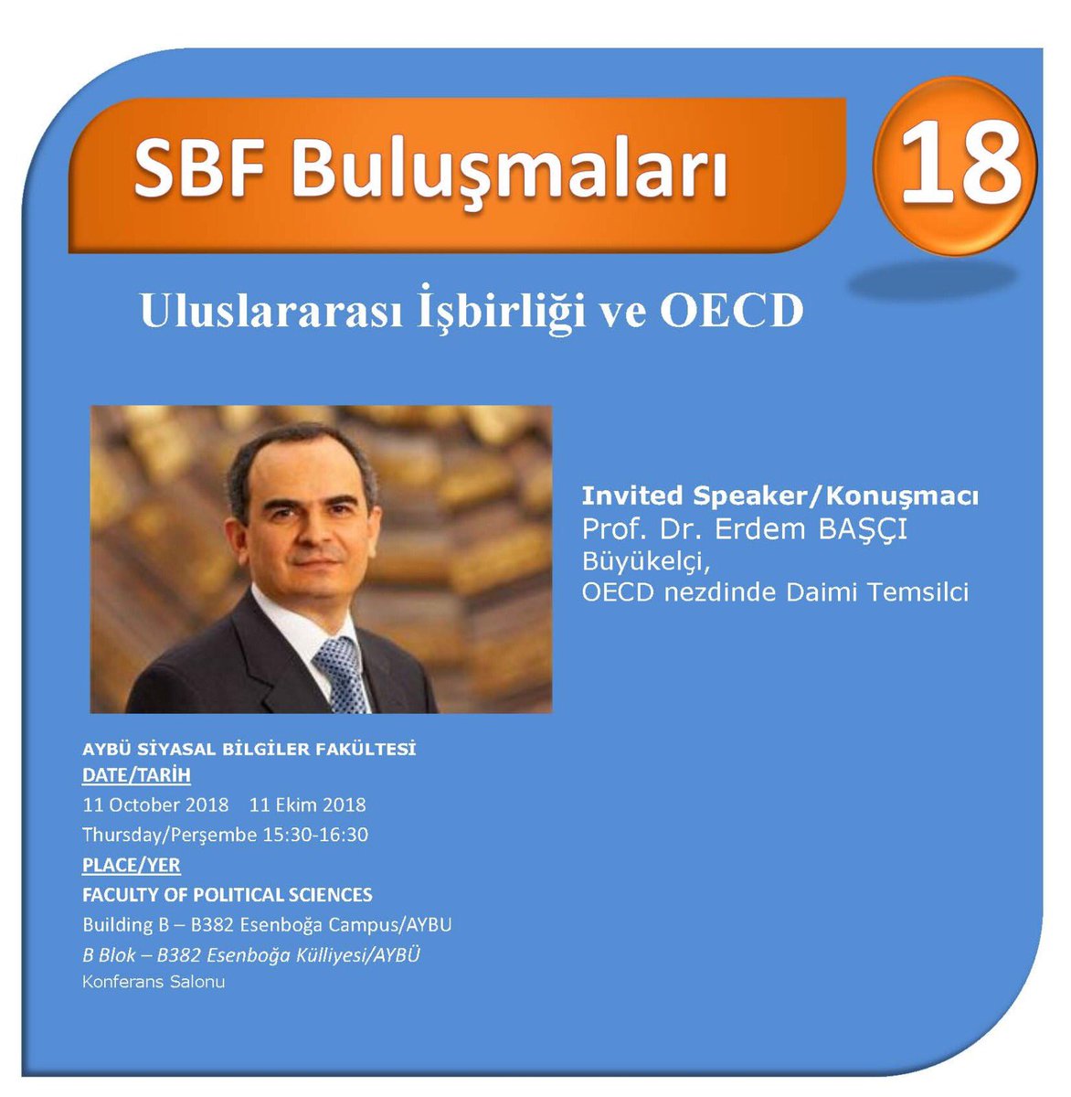 Ankara Yıldırım Beyazıt Üniversitesi Siyasal Bilgiler Fakültesi tarafından düzenlenen “Uluslararası İşbirliği ve OECD” konulu seminer, OECD Büyükelçisi Erdem Başçı'nın Merkez Bankası eski başkanı tarafından verildi.