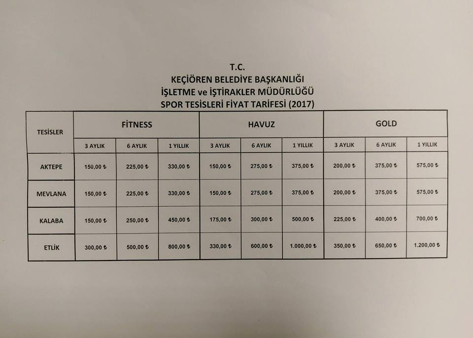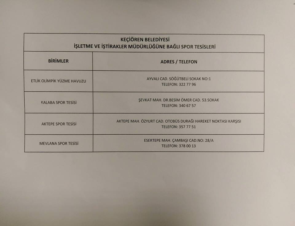 Keçiören Belediyesi Meclisi'nin almış olduğu karar gereği Belediyenin Spor Tesislerinden, ilçe sınırlarında yerleşkeleri bulunan üniversitelerin öğrencilerine % 50 indirim uygulanacaktır. Tesis adresleri ve fiyatları (mevcut ücretin yarısı tahsis edilecektir) ektedir.